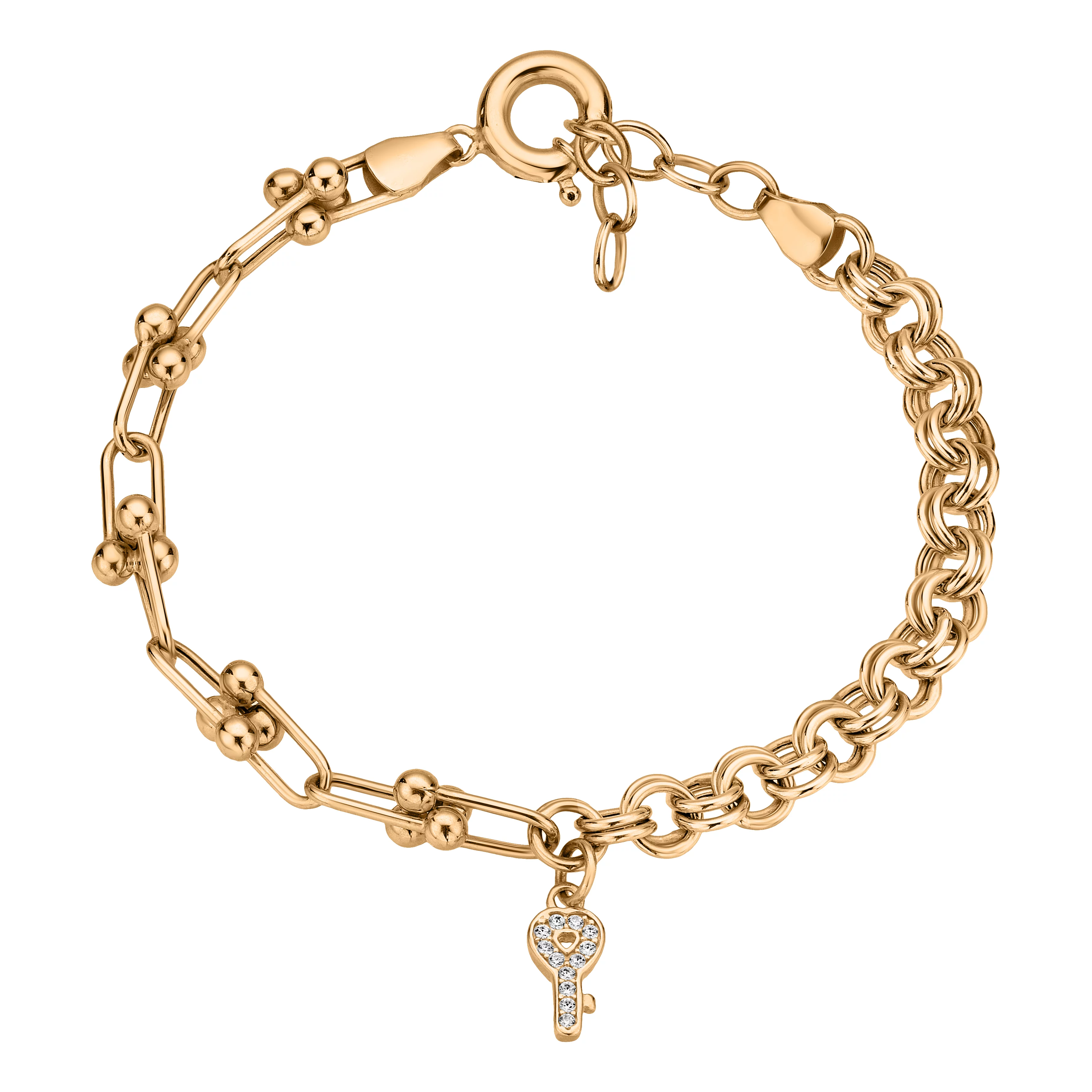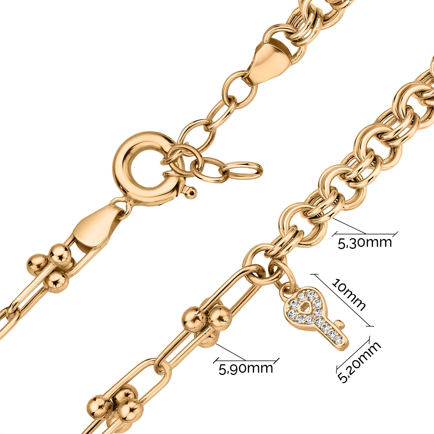 Браслет "Ключик" з підвісами та фіанітами у комбінованому золоті плетінням якір та шопард - 1920489