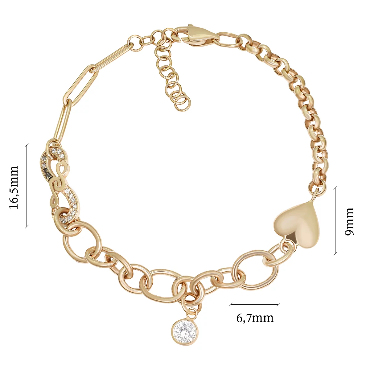 Об'ємний браслет поєднує трендові типи ланцюжків і підвісок. Як і модне міксування принтів в одязі, змішування різних матеріалів, фактур і форм, має стильний і актуальний вигляд. Ця модель складається з трьох ланцюжків: з довгими вузькими ланками, круглими, а середина різного діаметру і форми. Незвичайну комбінацію плетінь доповнюють вставки з цирконій, серця і знака нескінченності. Ця незвичайна прикраса стане чудовим акцентом у будь-якому образі вашого гардероба.