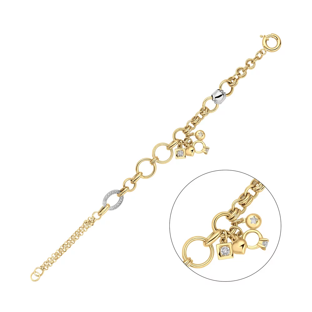 Браслет "Ключик" з підвісами та фіанітами у комбінованому золоті плетінням якір та шопард - 1920489