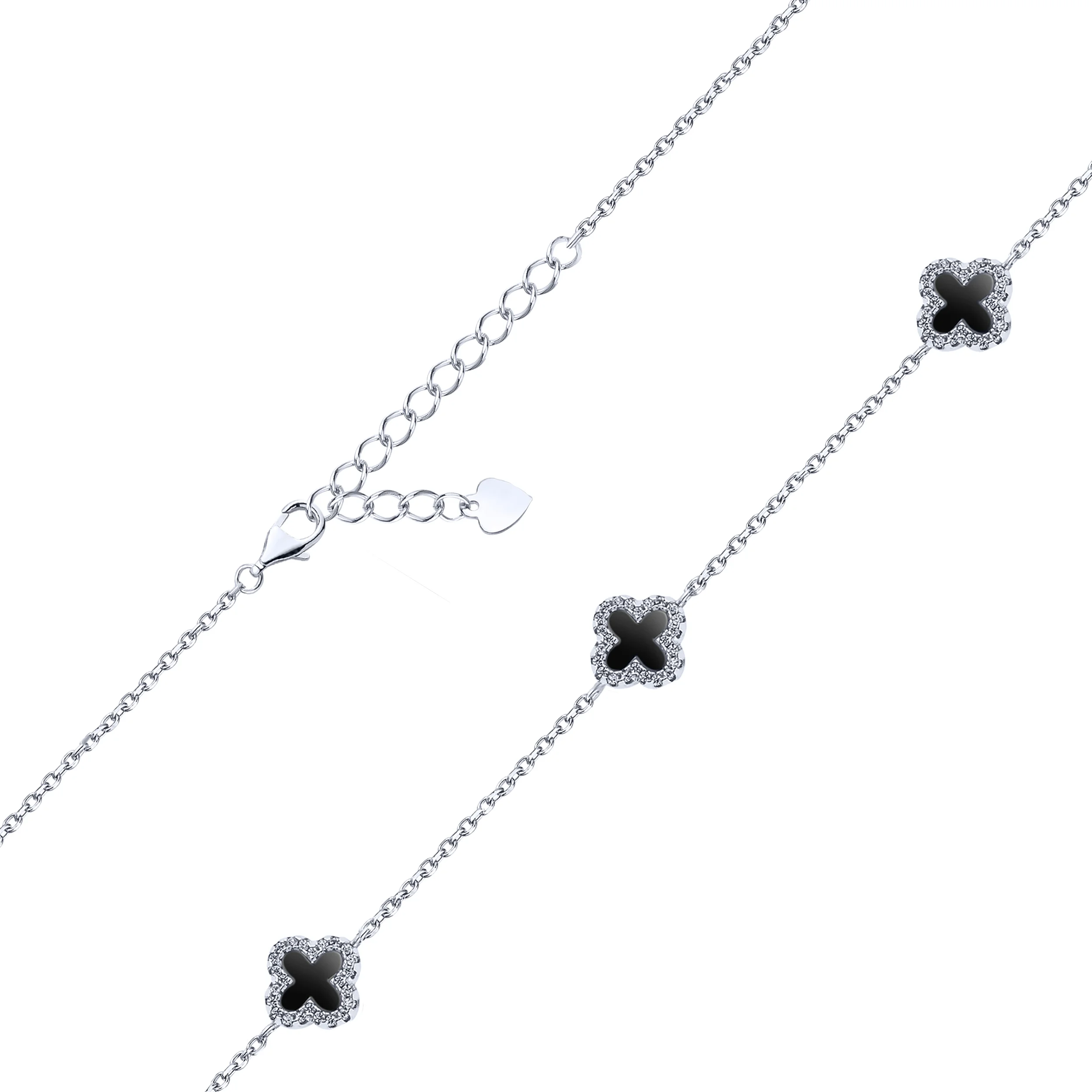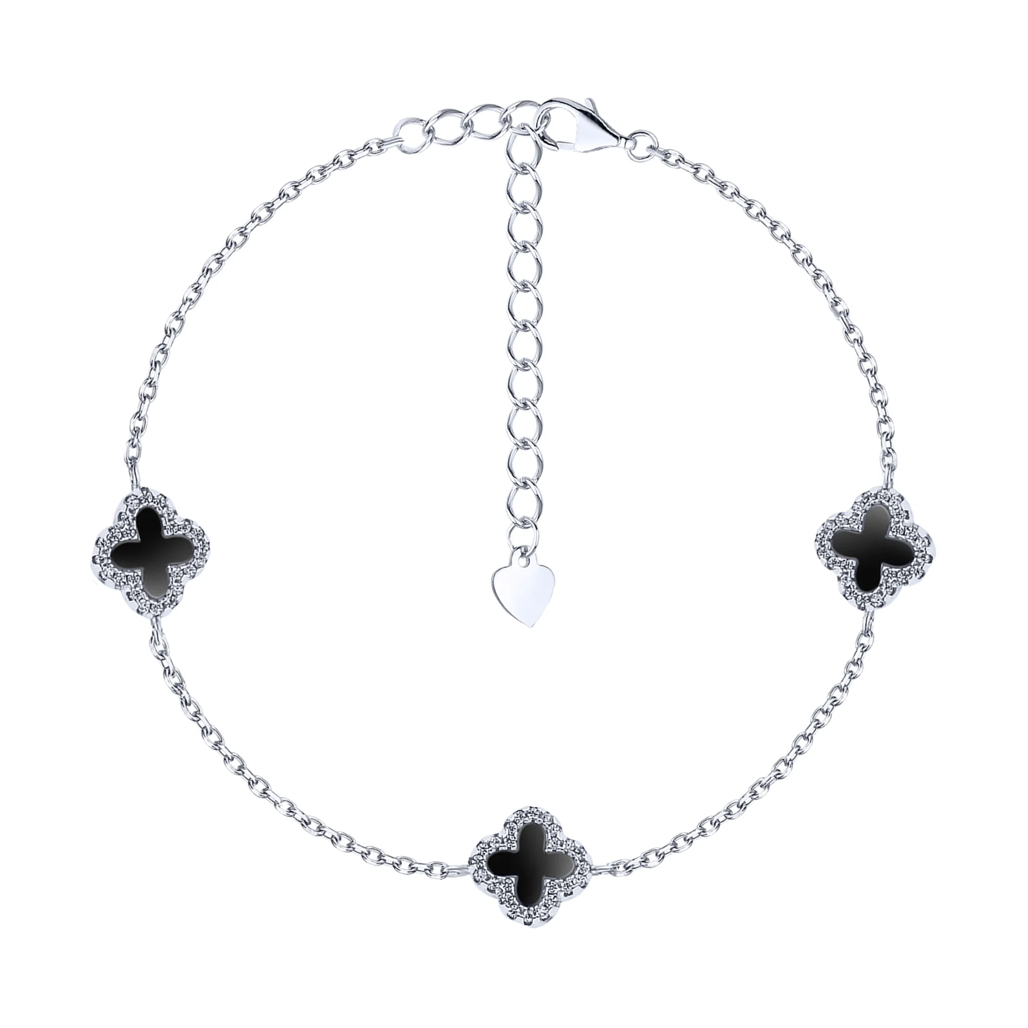 Браслет зі срібла "Конюшина" з оніксом та фіанітами плетіння якір - 2100048