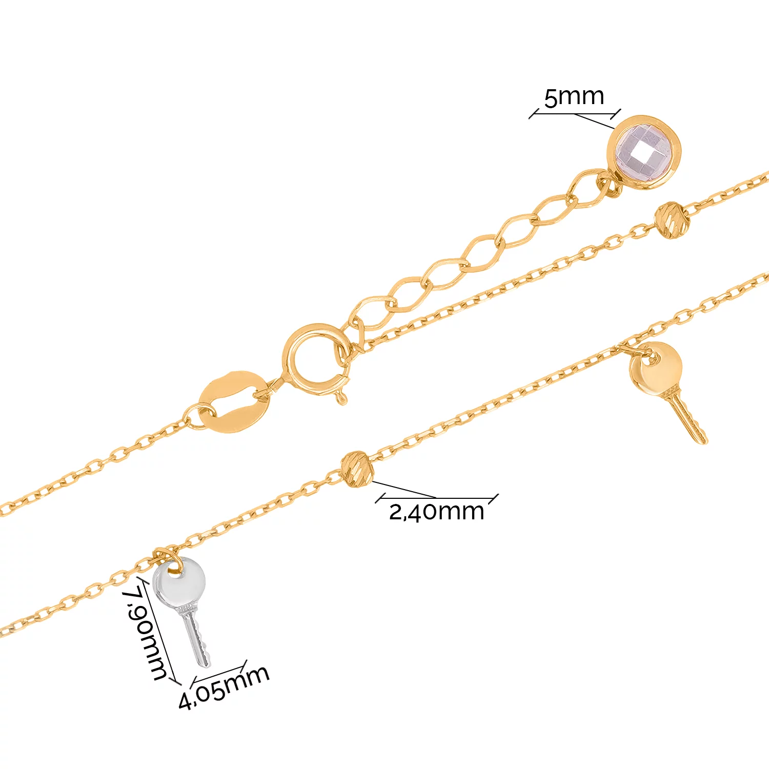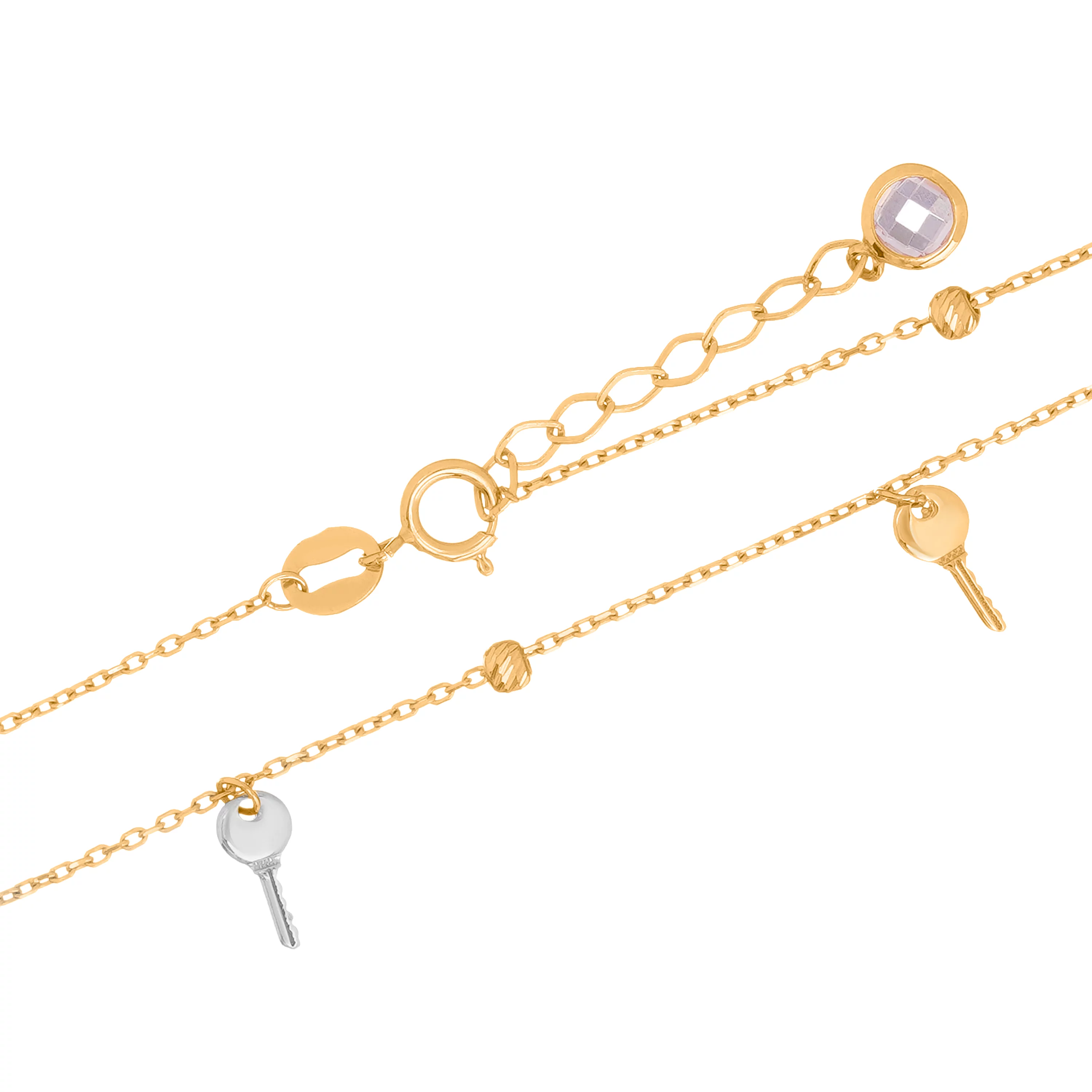 Браслет "Ключик" з підвісами та фіанітами у комбінованому золоті плетінням якір та шопард - 1920489