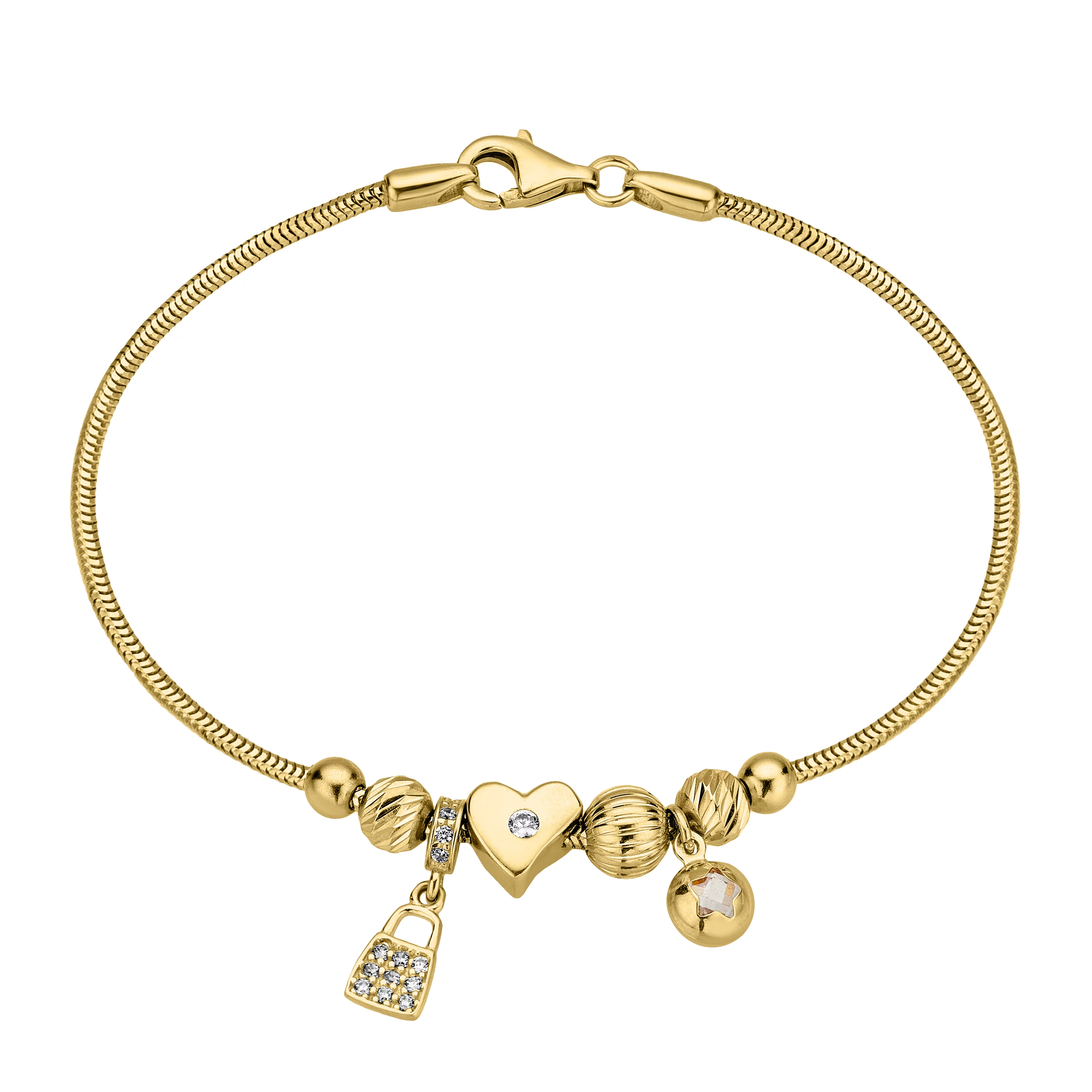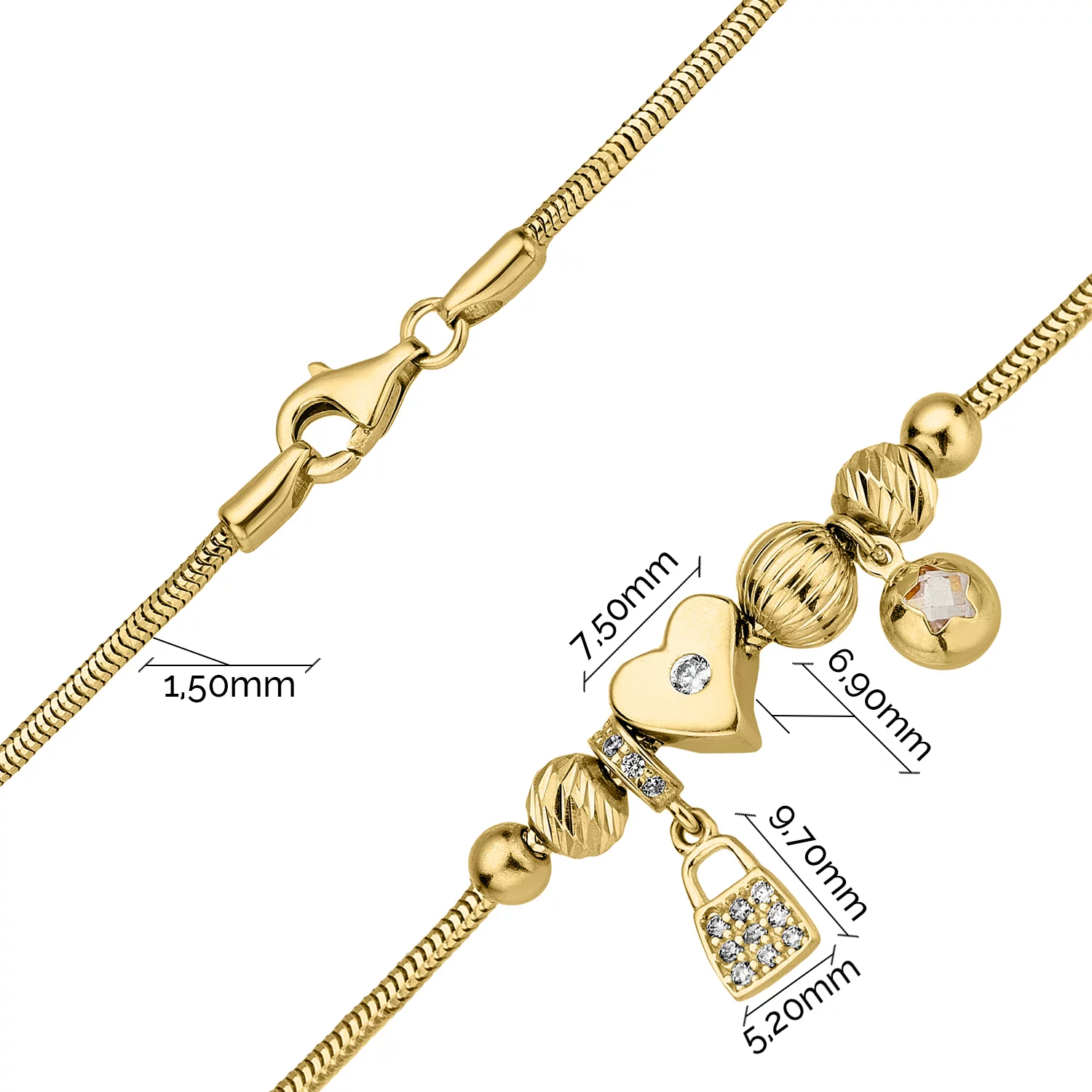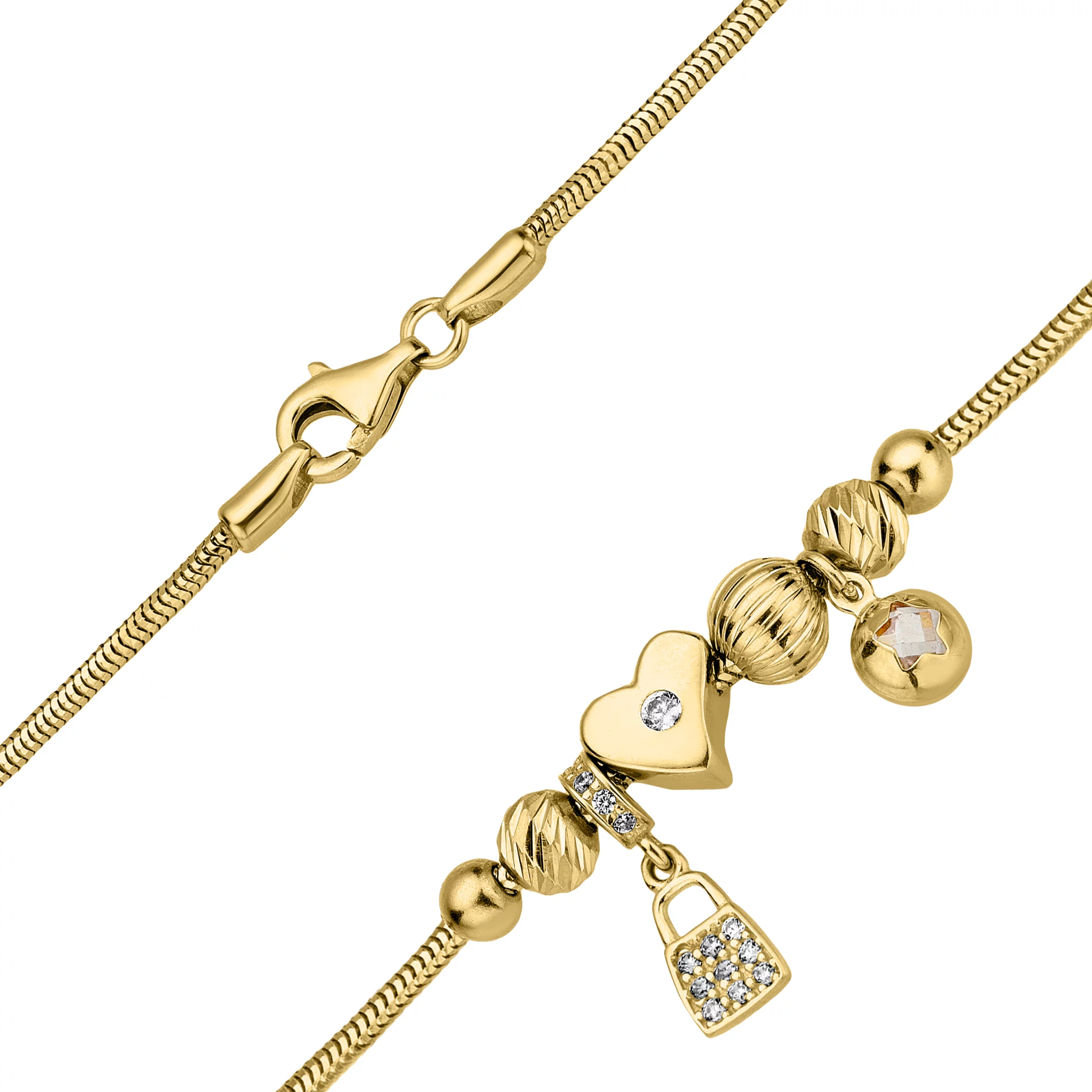 Елегантний браслет "Серце" з жовтого золота з підвісами і плетінням снейк - 1856606