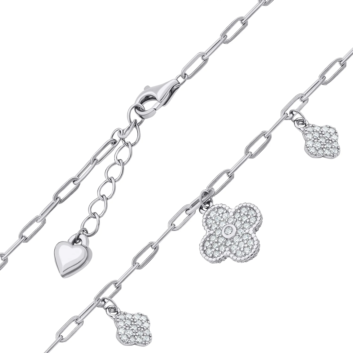Браслет срібний з підвісками "Конюшина" та фіанітами плетіння якірне - 1521378