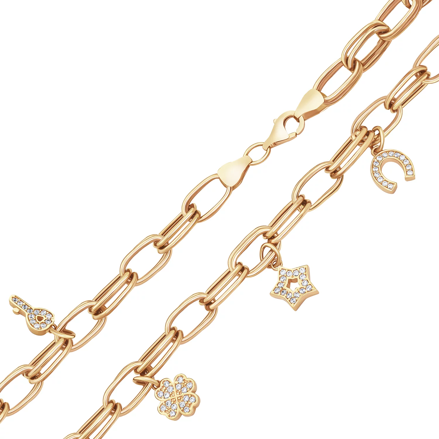 Браслет "Ключик" з підвісами та фіанітами у комбінованому золоті плетінням якір та шопард - 1920489