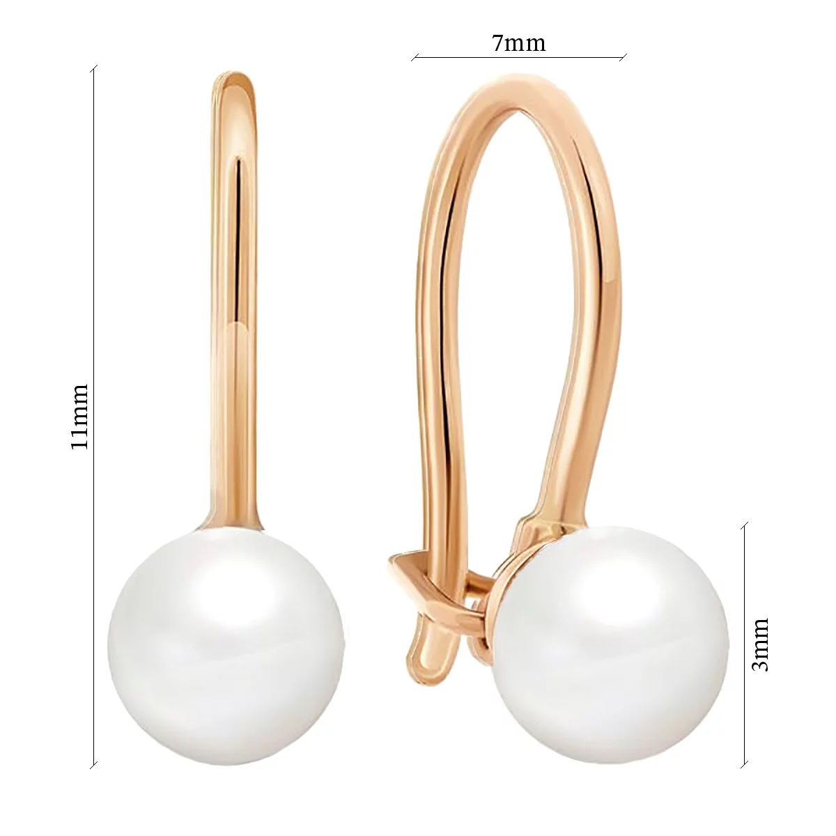 Гарний небанальний подарунок дівчинці — золоті сережки з перлами. Мініатюрні та легкі, декоровані маленькими перламутровими намистинами, вони прищеплять дитині почуття прекрасного і розвинуть естетичний смак. Дужка обтічної форми та надійний французький замок не створять незручностей, дівчинка зможе просто вдягати та знімати прикраси. Золото 585 проби гіпоалергенно та безпечно для дитячого організму. Перли добре закріплені в гніздах за допомогою клею, їхня гладка поверхня не чіплятиметься за волосся. Конструкція лаконічна, але вироби виглядають миловидно.