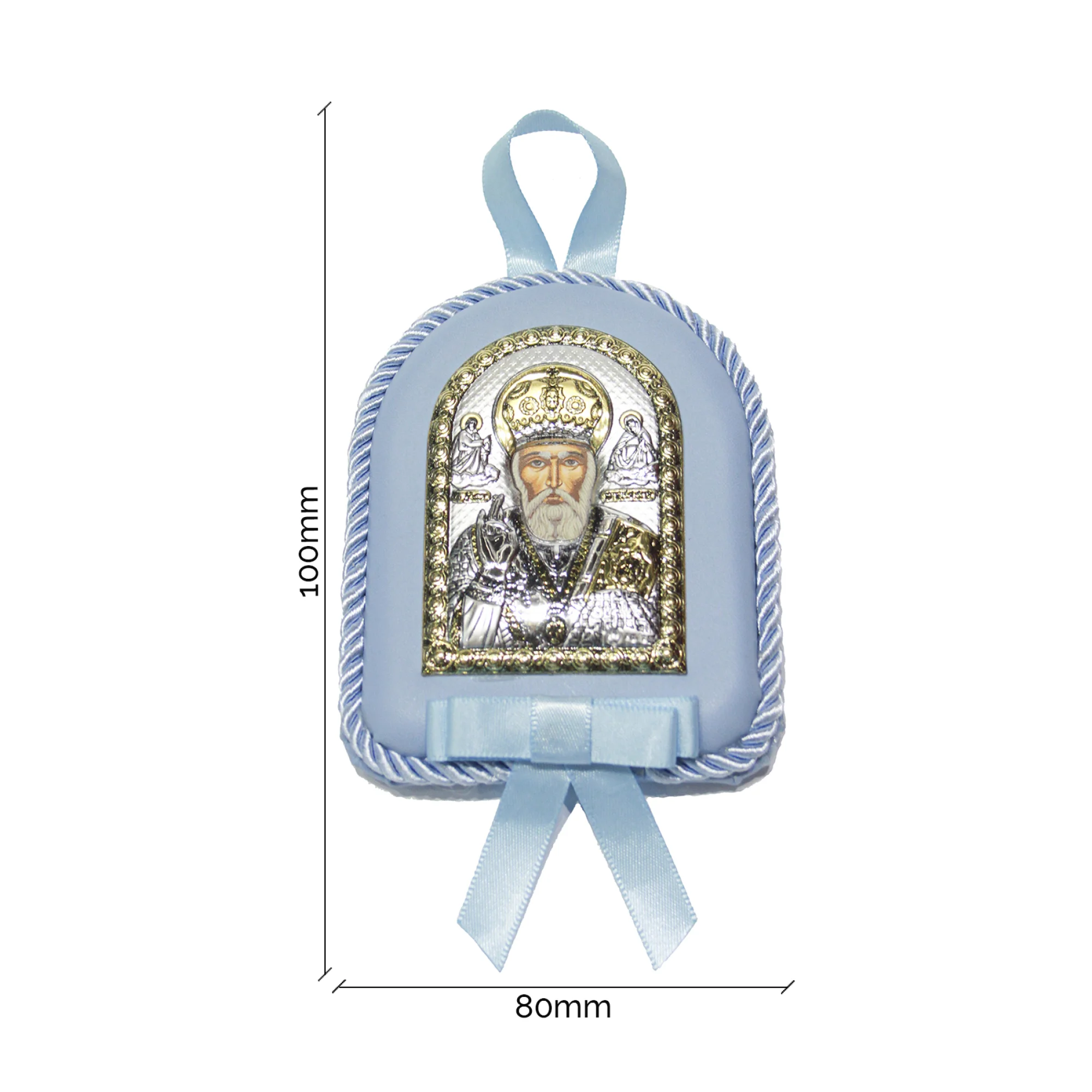 Ікона «Микола Чудотворець» — унікальний подарунок для хлопчика. Презент має як релігійне, так і історичне значення. Прикраса розташована на подушечці, декорованій бантиком та окантовкою у вигляді шнурка. Синій колір символізує небесну чистоту та невинність дитини. Виріб доповнений петелькою, тому його можна повісити над дитячим ліжечком для захисту від негативної енергії. Завдяки тому, що святий вважається покровителем малюків, виріб підійде як подарунок як на день народження, так і на хрестини.