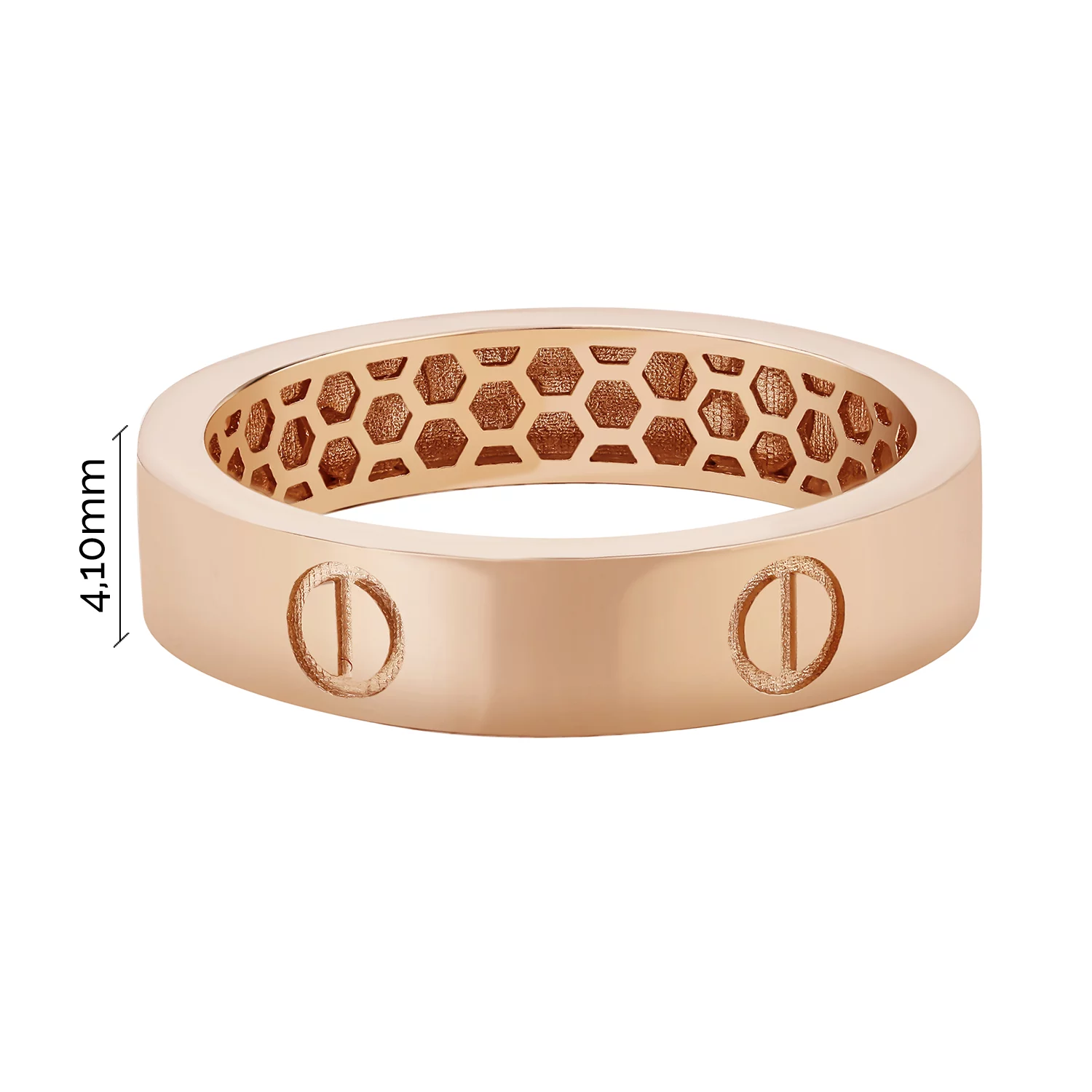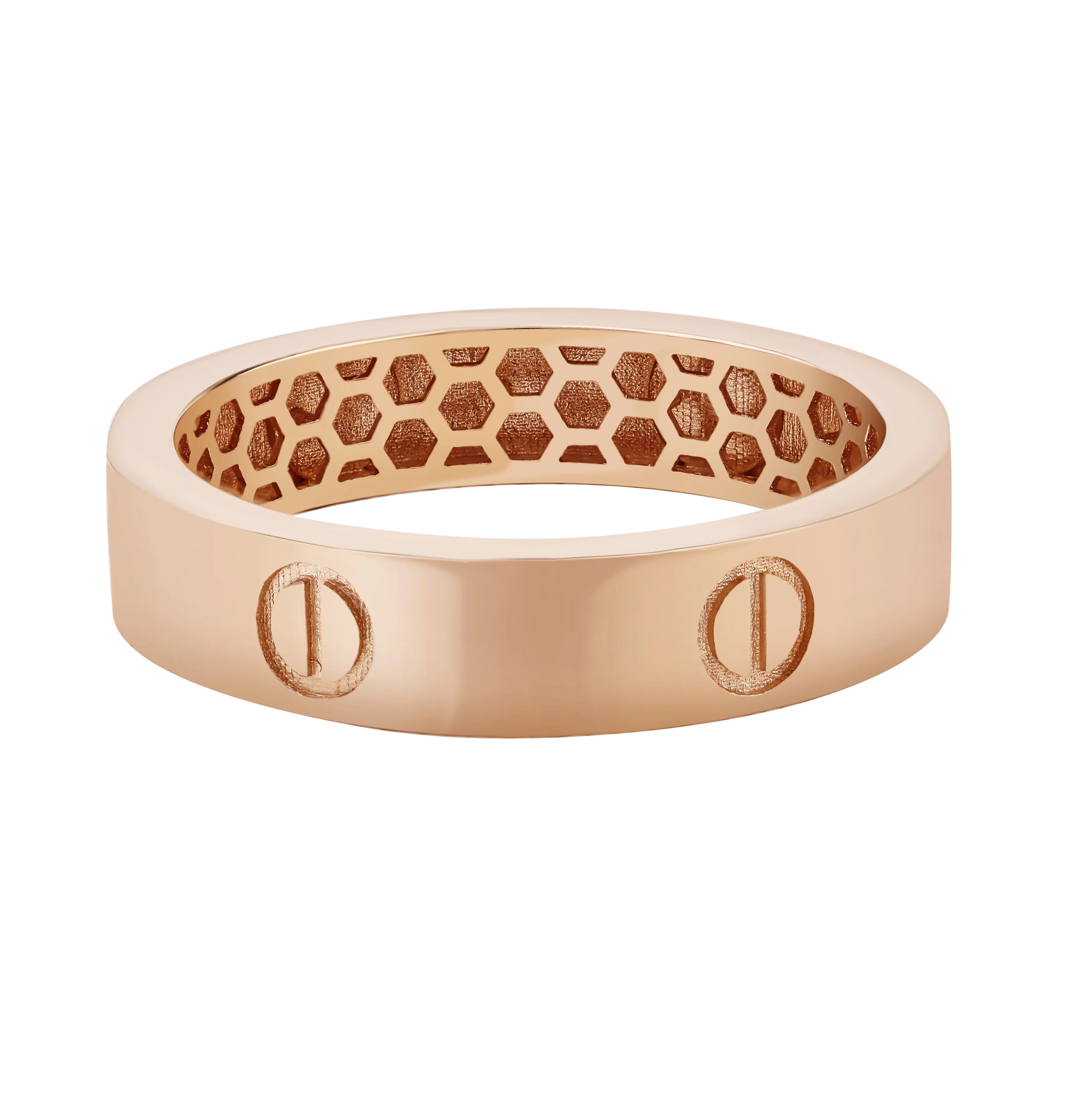 Елегантна каблучка Love із червоного золота в стилі Картьє — вишукана прикраса, яку можуть носити як жінки, так і чоловіки. Широкий обідок робить її помітною на руці, а внутрішня сторона, що нагадує бджолині стільники, додає оригінальності. Ювелірний виріб виконаний із дорогоцінного металу 585 проби. Червоного відтінку надає золоту мідь, додана до складу лігатури сплаву (9,5%). Це універсальна прикраса, яка може стати пам'ятним подарунком на день народження та інші свята. Каблучка Love доповнить будь-який образ — від повсякденного до урочистого.