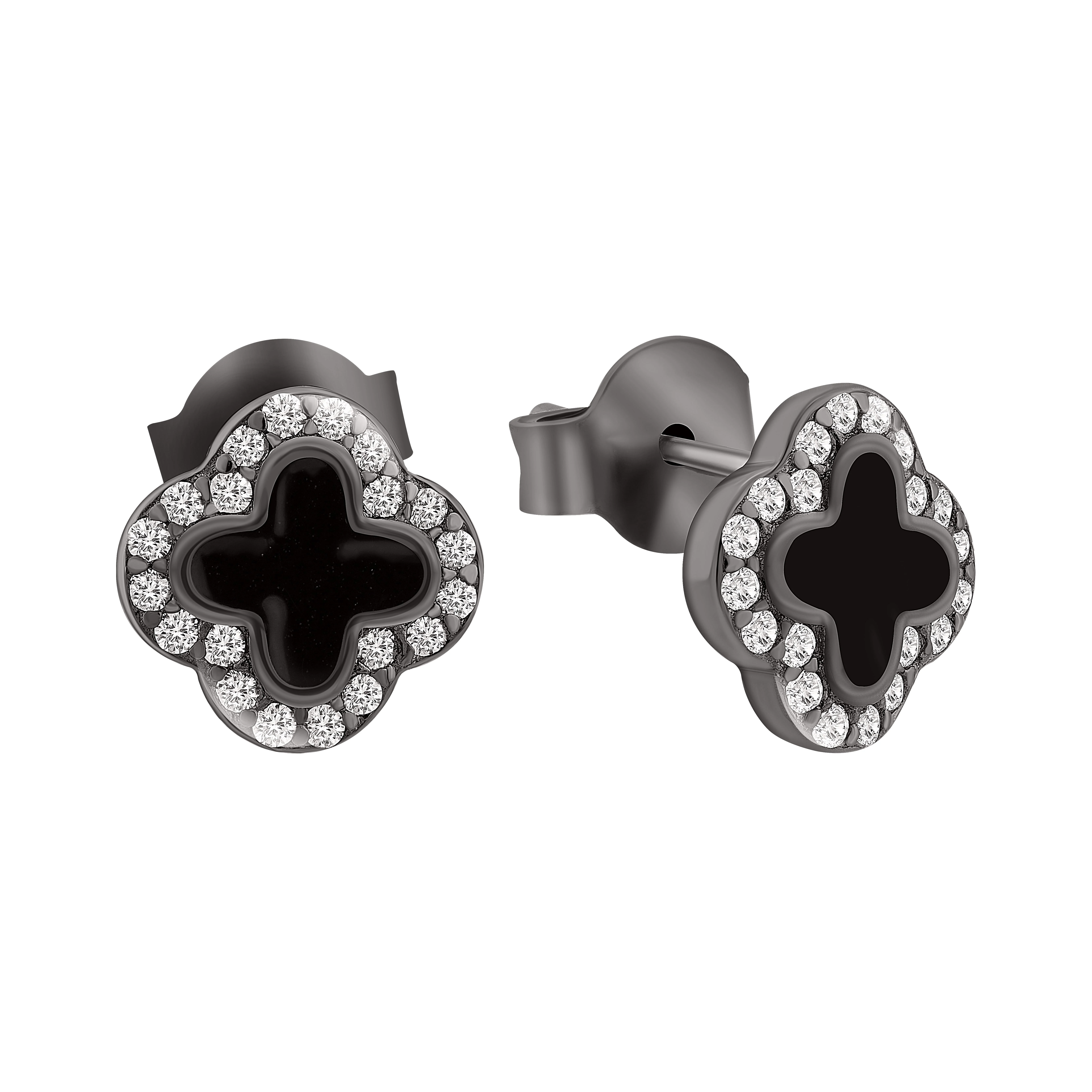 Елегантні срібні сережки "Конюшина" з чорним родіюванням, емаллю та фіанітами - 1979410