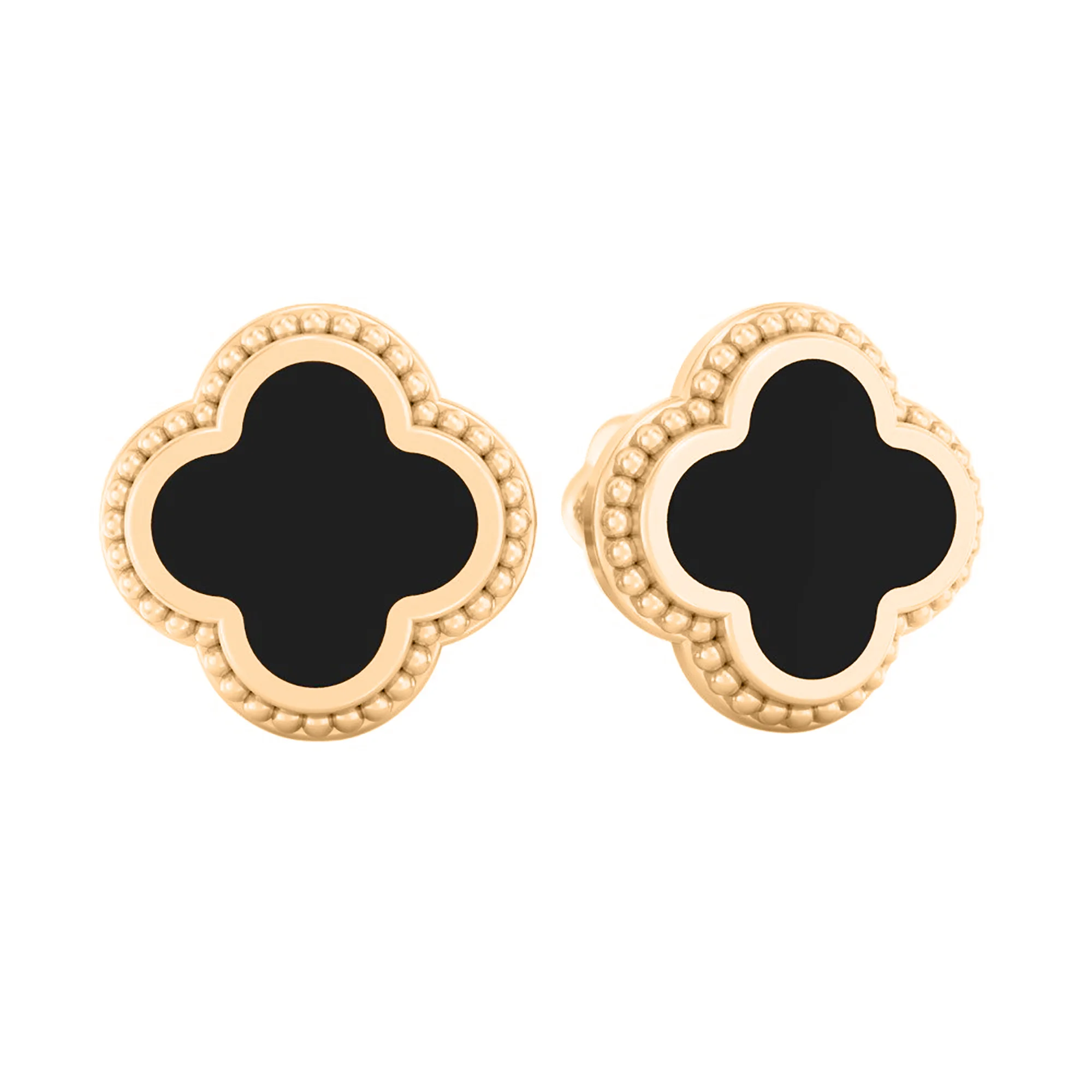 Елегантні сережки-пусети «Конюшина» в червоному золоті з емаллю створені в стилі Ван Кліф і стануть соковитим доповненням до жіночих образів — як вечірніх, так і повсякденних або ділових. Виготовлено прикраси з дорогоцінного металу 585 проби, до лігатури сплаву якого додано 9,5% міді. Завдяки такому складу золото набуло теплого червоного відтінку й має яскравий вигляд на контрасті з темною емаллю. Вставки розміщені всередині об'ємних основ, виконаних у формі чотирилистої конюшини. Закріпити сережки-пусети у вухах допомагають затискачі-метелики.