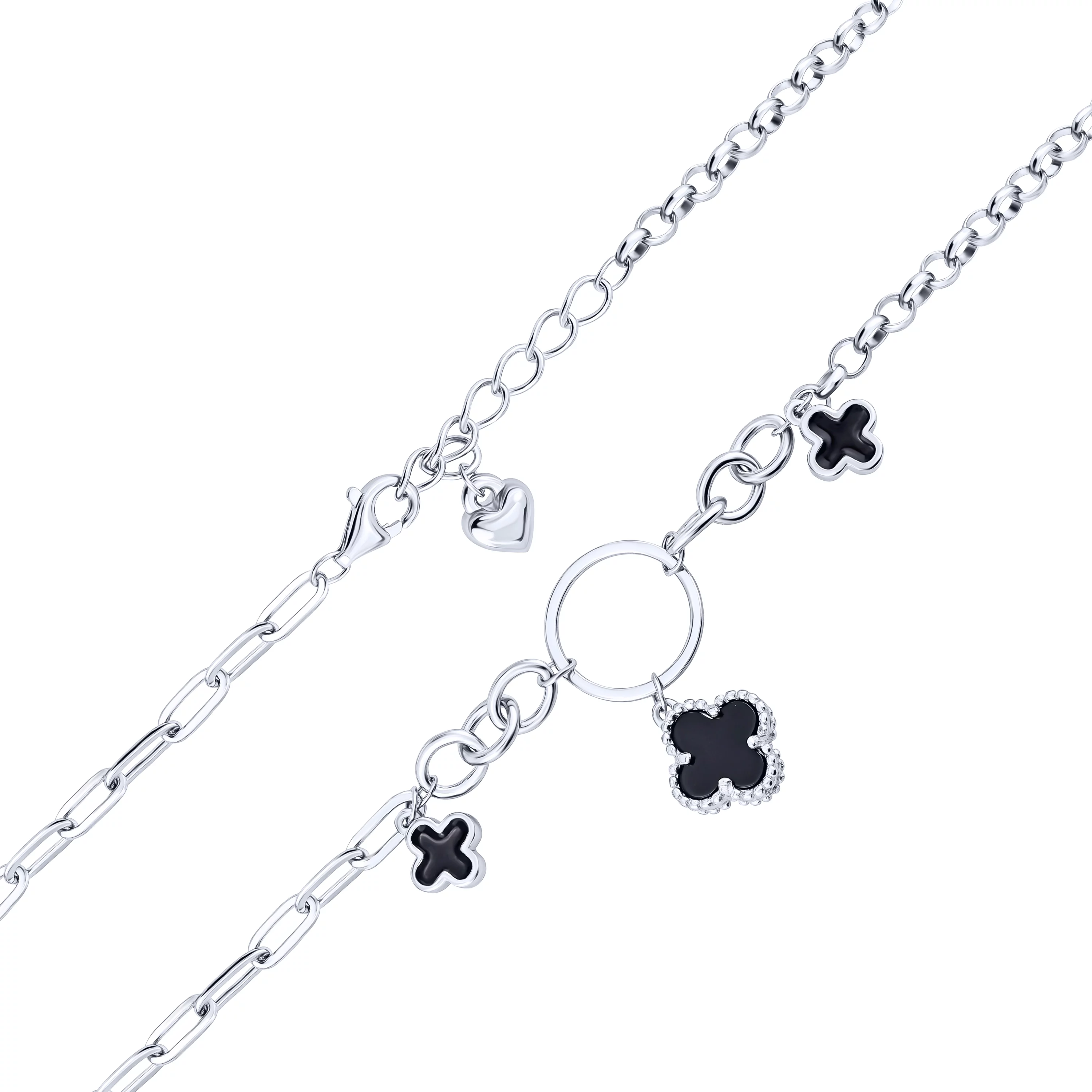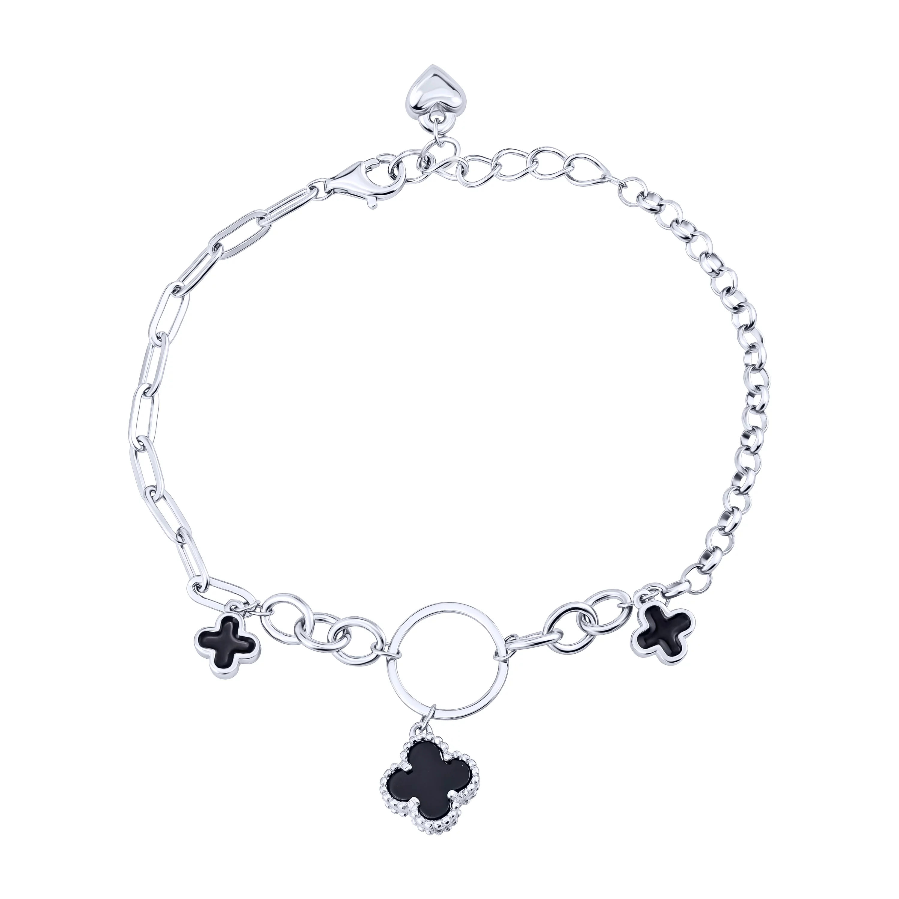 Срібний браслет з підвісками "Конюшина" з емаллю та фіанітами плетіння якір - 1693629