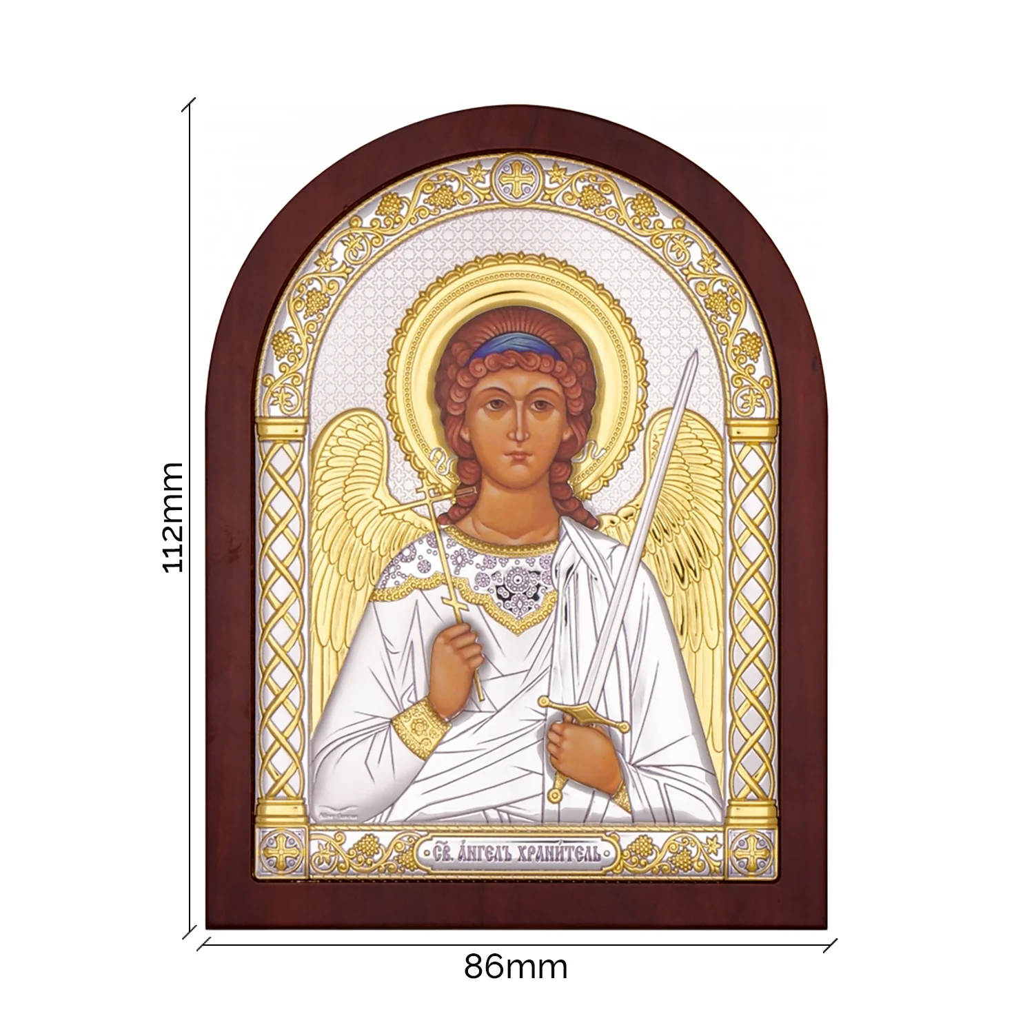 Срібна ікона із зображенням Ангела Хранителя — це безликий образ (ні чоловік, ні жінка). У правій руці — хрест як символ Божого благословення, у лівій — меч, знак захисту. Одягнений ангел у білий плащ із накидкою. На рукавах зроблені красиві золотисті манжети, а на шиї — широке візерункове окантування двох кольорів. Навколо голови ангела — німб, ознака небесного походження, а за спиною — крила, які показують, що він може швидко пересуватися. По периметру образу — золота рамка (з боків у вигляді колон, на які спирається напівкругле склепіння із зображенням виноградної лози).