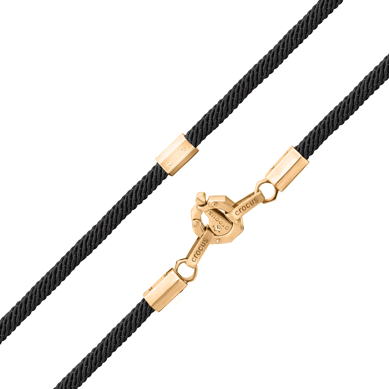 Чорний ювелірний шнурок з бавовни із золотими вставками. Застібається коштовність шпрингельним замком. Фіксатор складається з пружинного механізму і кільця, він забезпечує надійність конструкції. Вставки виконані з червоного золота. У складі металу мідь, вона задає відтінок і підвищує фізико-хімічні властивості сплаву, надає міцність і зносостійкість. Золото 585 проби, кількість ауруму — 58,5%. Виріб виконаний в універсальному стилі. Його легко комбінувати з різним вбранням, прикраса доповнить святковий і повсякденний образи.