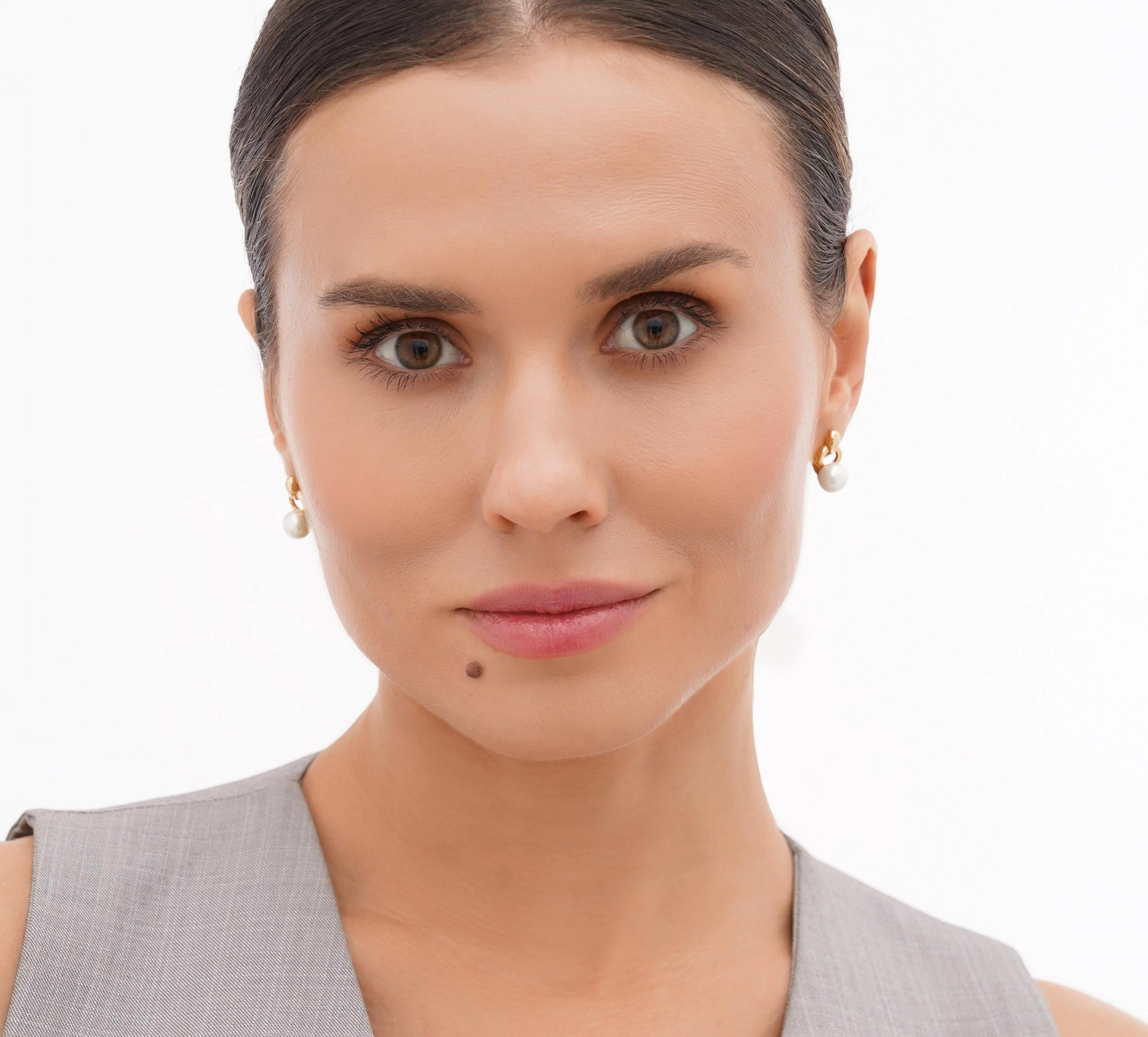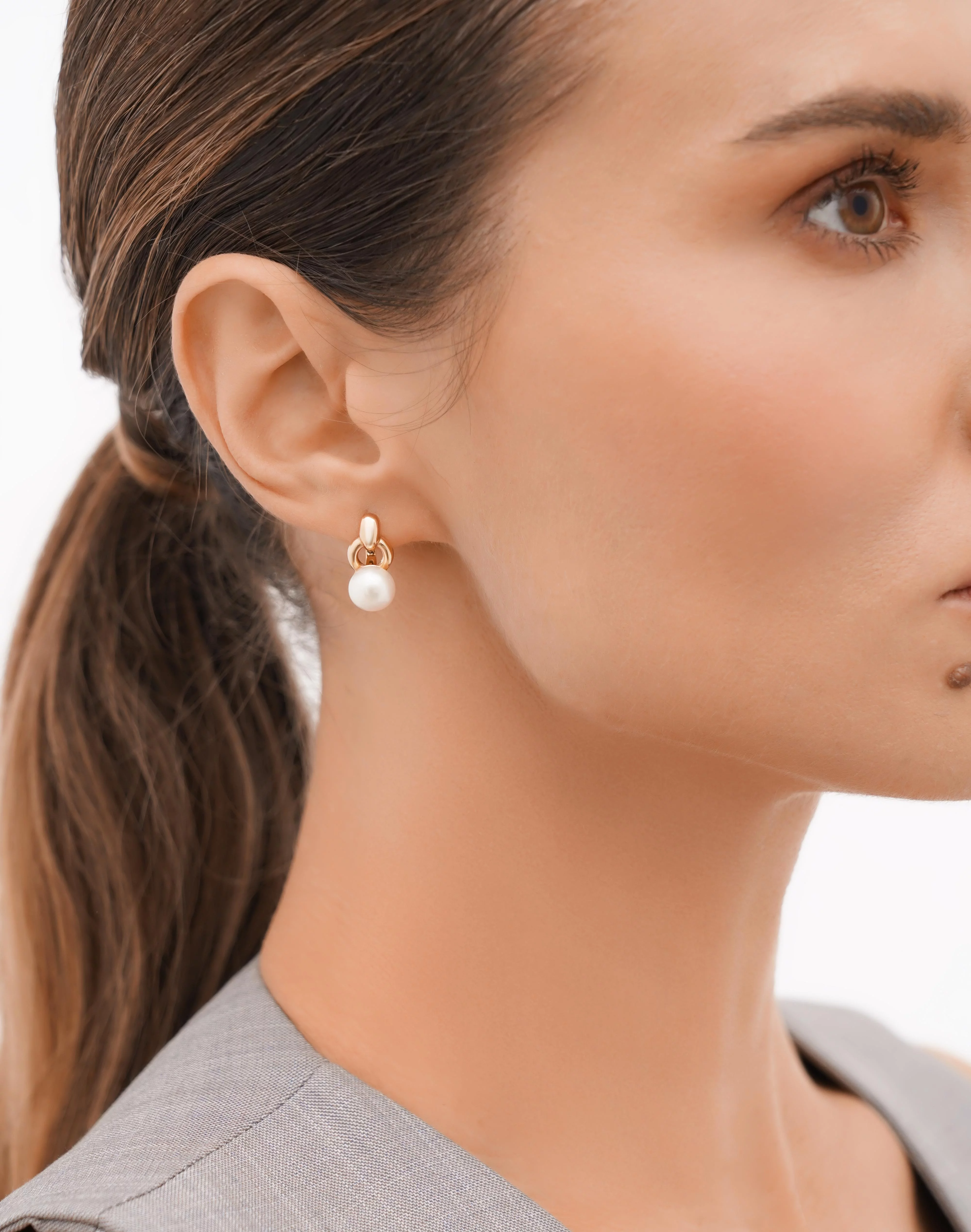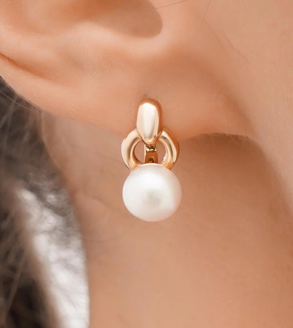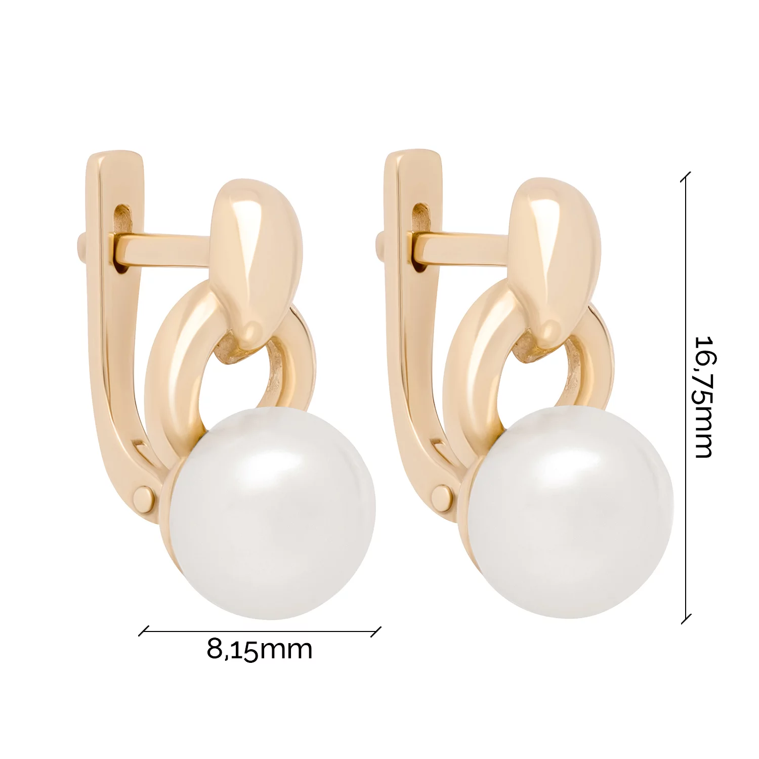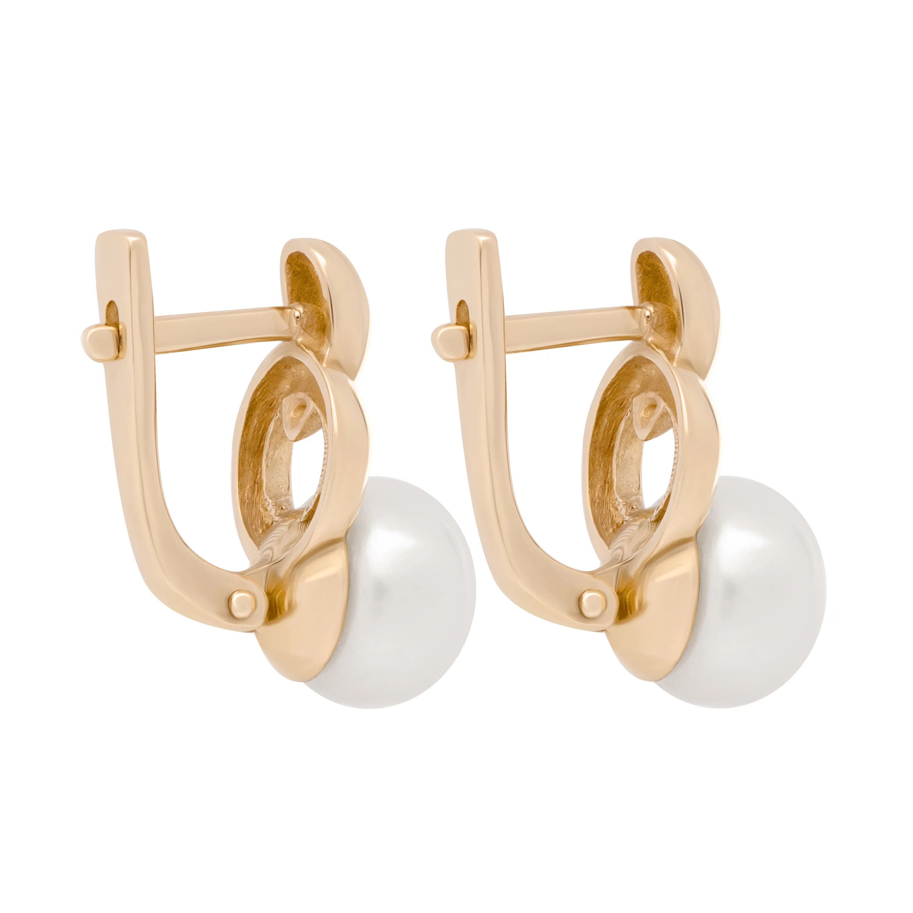 Сережки у формі листочка з червоного золота з перлиною і фіанітами - 1630904