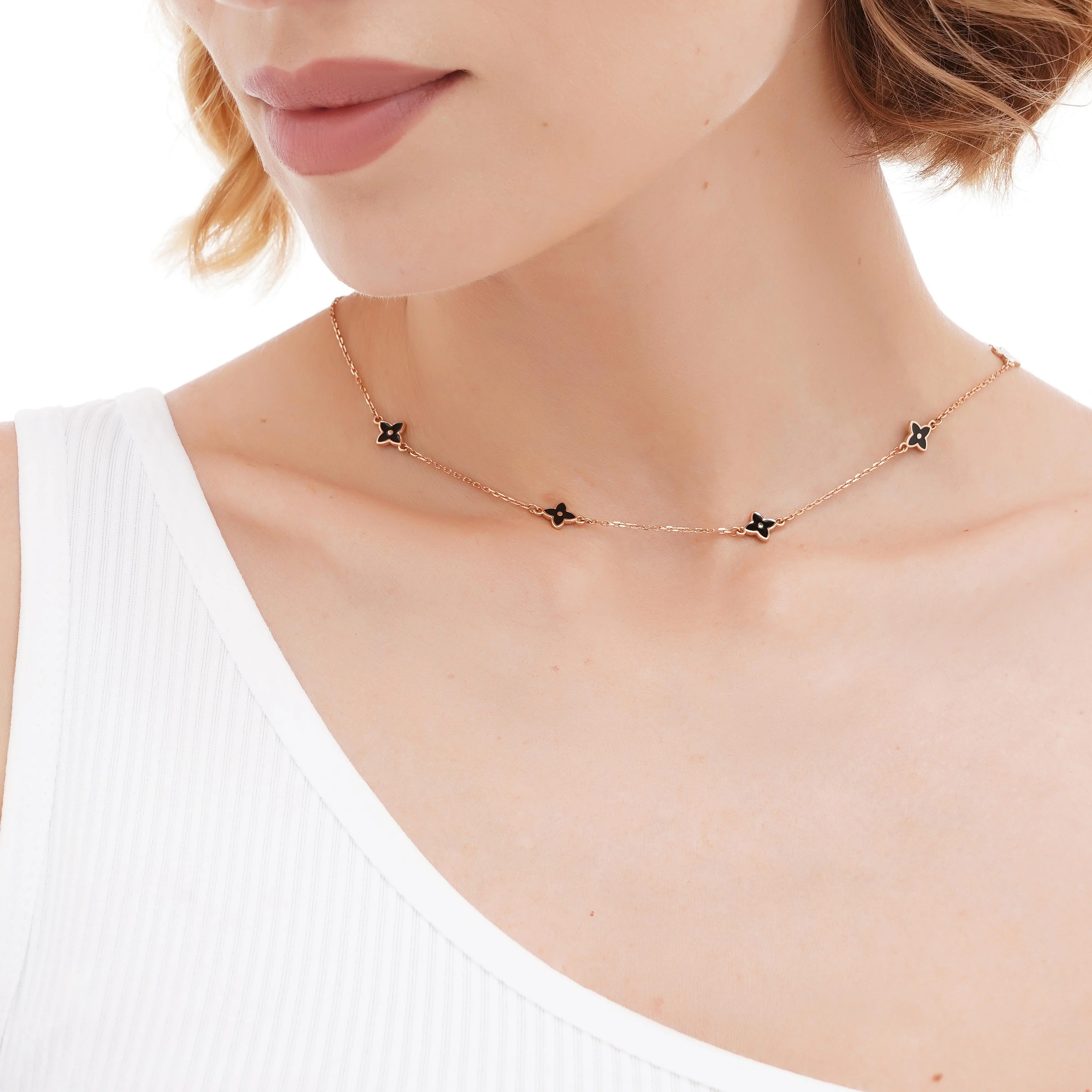 Стильне кольє-краватка "Квіти" у червоному золоті з емаллю та якірним плетінням - 1941367