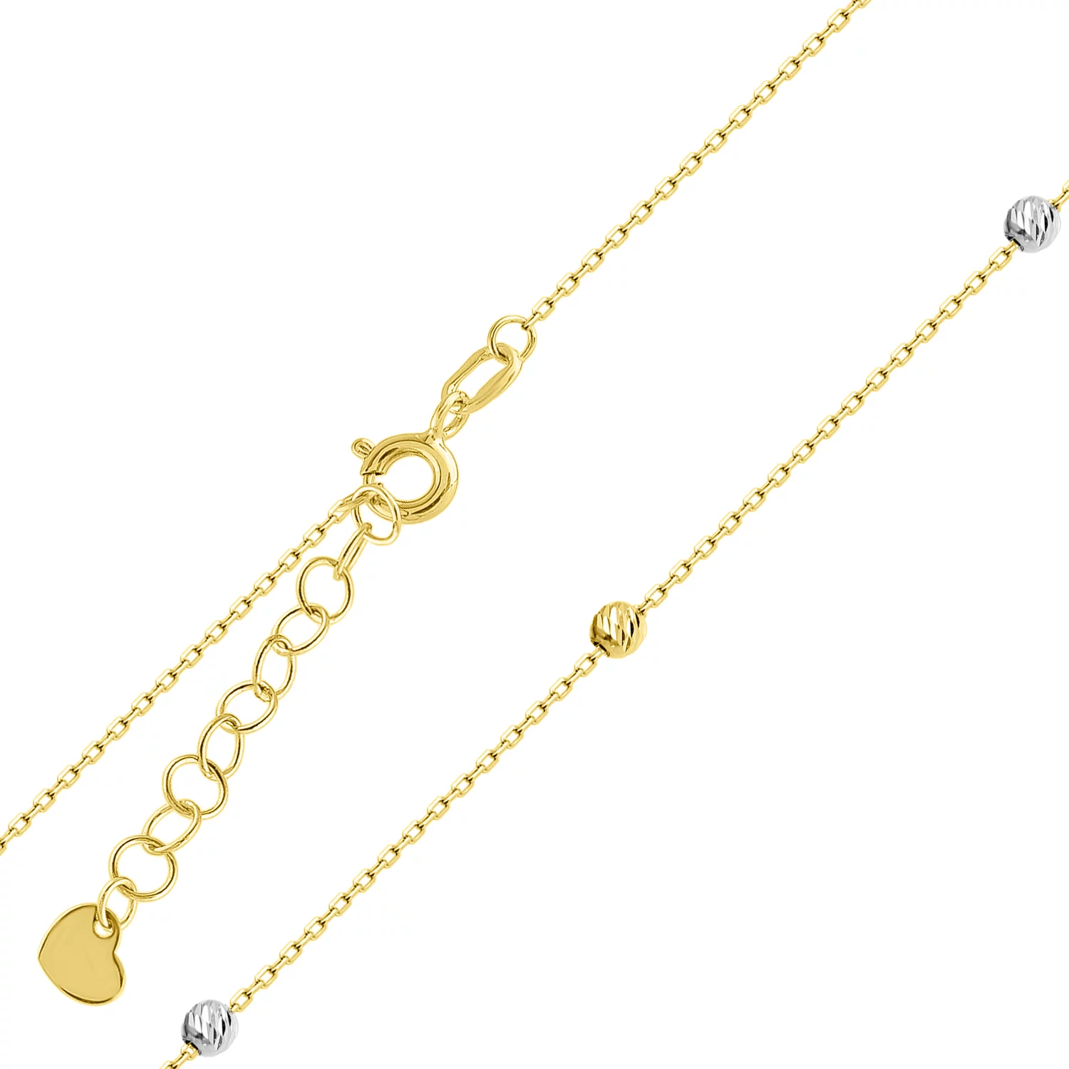 Кольє з кульками з жовтого і білого золота - витончене поєднання елегантності та витонченості. Тонкий ланцюжок, прикрашений вишуканими золотими та білими кульками, надає прикрасі неповторної чарівності та легкості. Кожна деталь продумана до досконалості, щоб підкреслити ваш стиль і витонченість. Шляхетне поєднання жовтого і білого золота 585-ї проби надає кольє особливого блиску, міцності та довговічності. Завдяки зручному регулюванню довжини прикраса легко адаптується до будь-якого образу - від повсякденного до урочистого. А мініатюрне золоте сердечко на застібці додає кольє ніжний і зворушливий акцент. AURUM jewelry - український бренд, який вже багато років радує клієнтів стильними та якісними прикрасами за доступними цінами. Подаруйте собі або близькій людині частинку розкоші, яка стане ідеальним доповненням до будь-якого гардеробу!