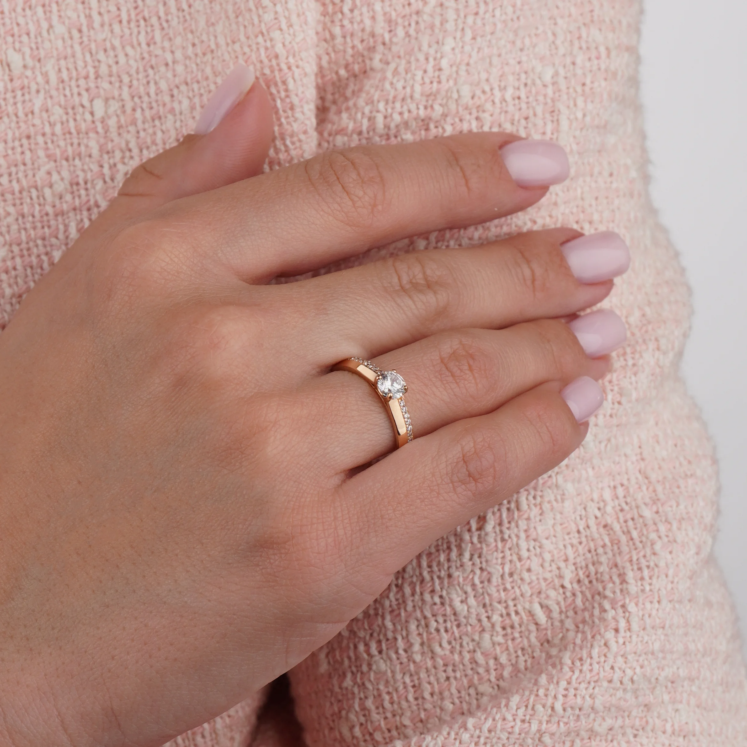 Вишукана каблучка для заручин. Вона створена з червоного золота 585 проби. Гарний відтінок отримано в результаті легування сплаву 9,5% міді. Головна родзинка прикраси – великий фіаніт, що красується в центрі обода. Для його кріплення використовувався крапановий метод фіксації. Завдяки цьому камінь хоч і підноситься над поверхнею, але не чіпляється за одяг, волосся. Додатково ювелірний виріб інкрустовано дрібними фіанітами. Вони розташовані вздовж одного краю обода. У всіх самоцвітів кругле огранювання для ідеальної гри в променях сонця.