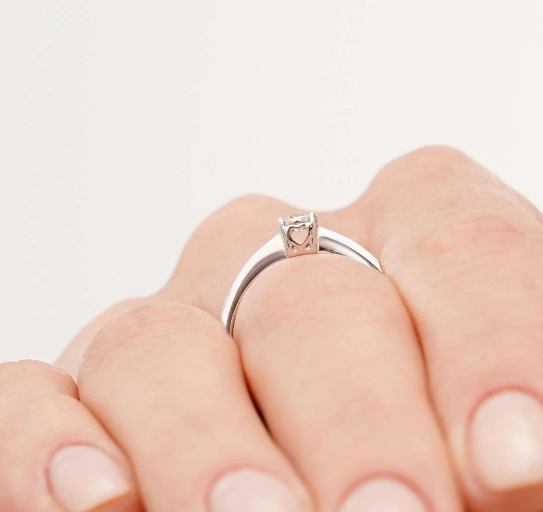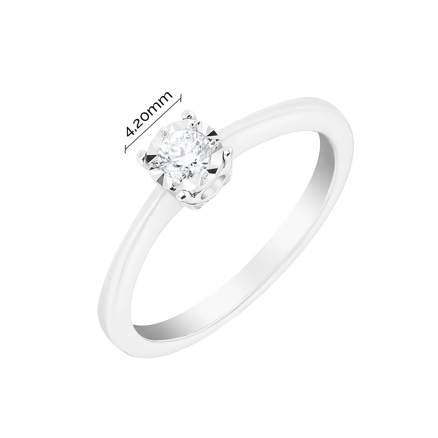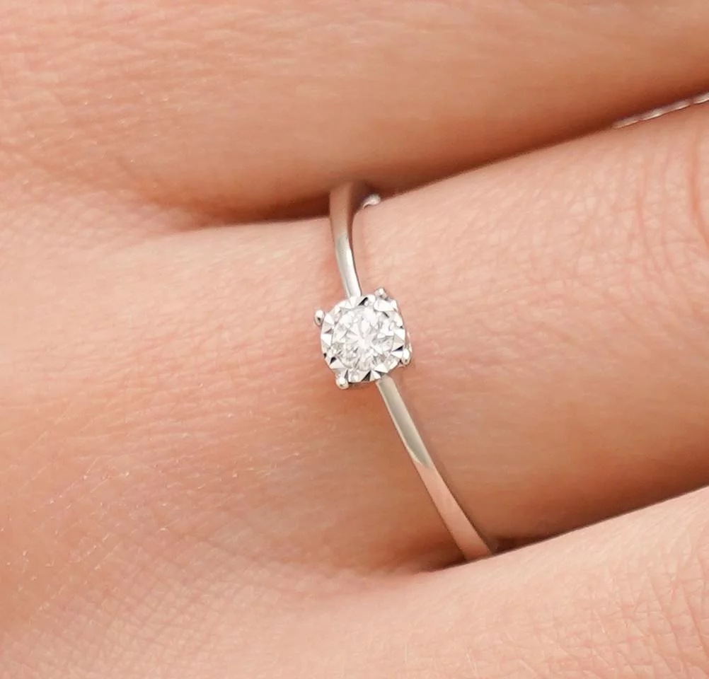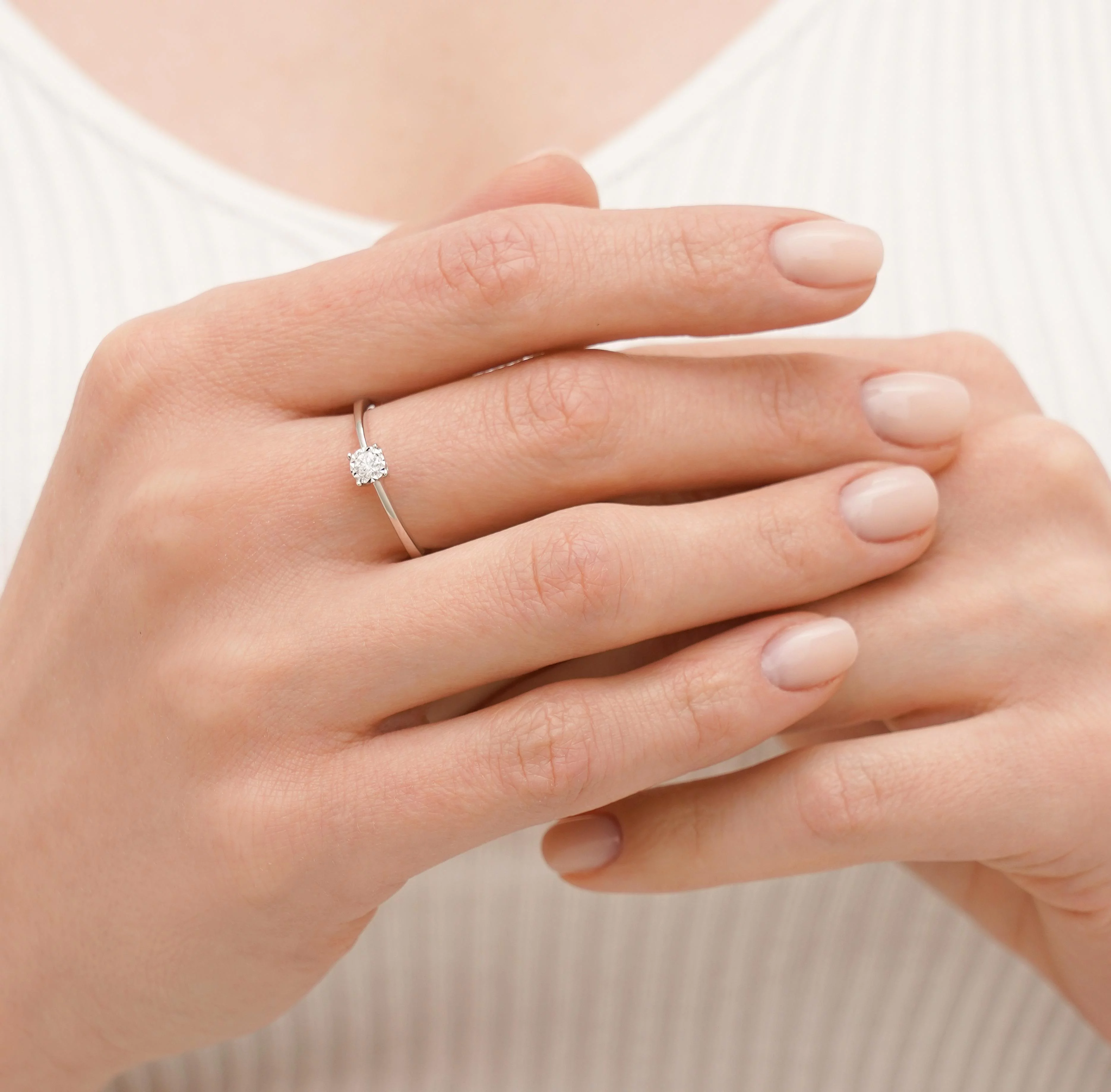 Золота каблучка з діамантом — ювелірний виріб для заручин, з яким чоловік приходить до коханої, щоби почути заповітне: «Так!». Прикраса в класичному стилі — витончений обідок, на верхівці якого сяє дорогоцінний камінь, а десятки його граней відбивають світло, створюючи казкове сяйво. Додає блиску білий колір золота 585 проби, отриманий за допомогою внесення до лігатури сплаву 9,5% паладію. Прикрасу можна поєднувати з іншими виробами, у тому числі носити одночасно з обручкою з дорогоцінного металу такого ж кольору.
