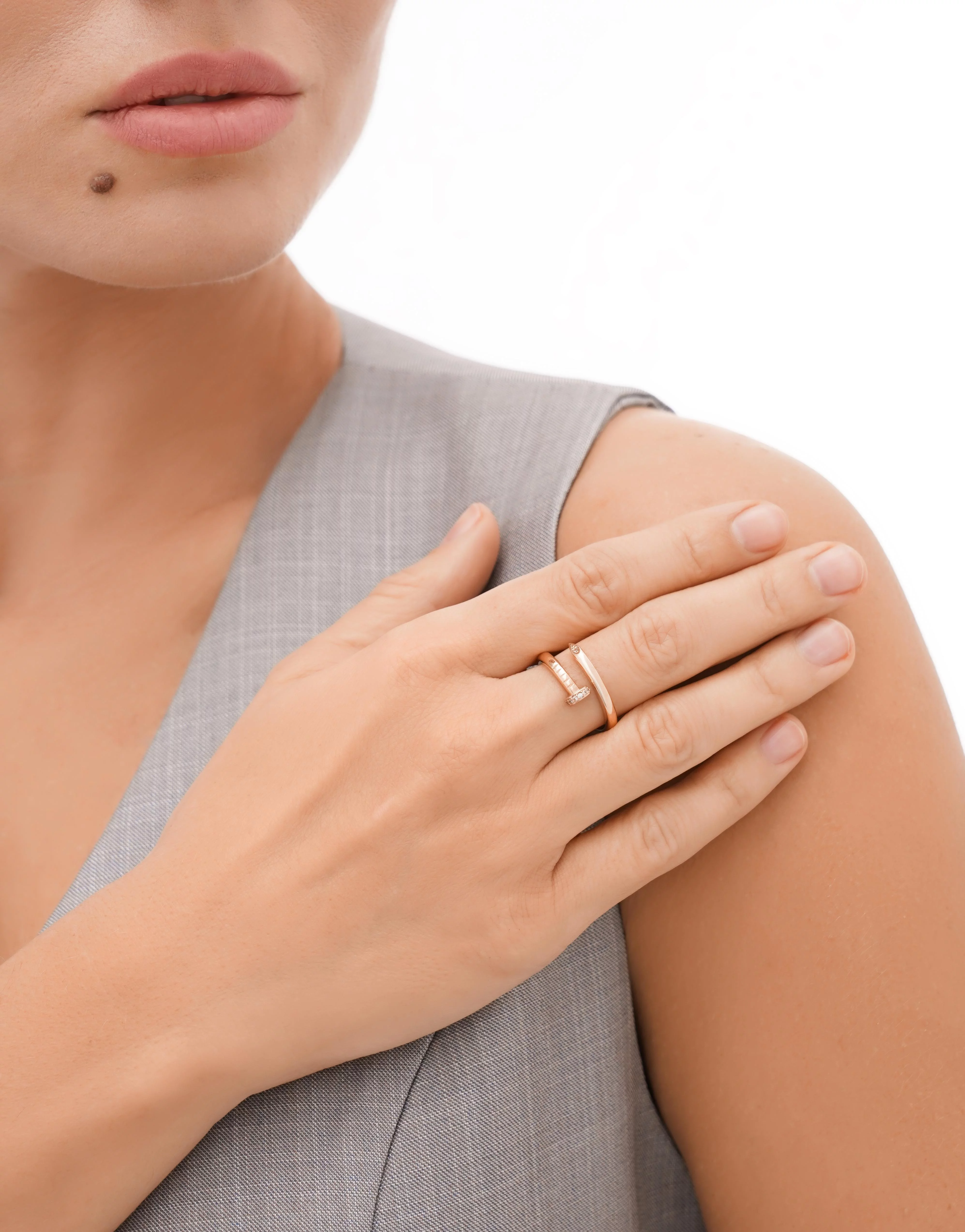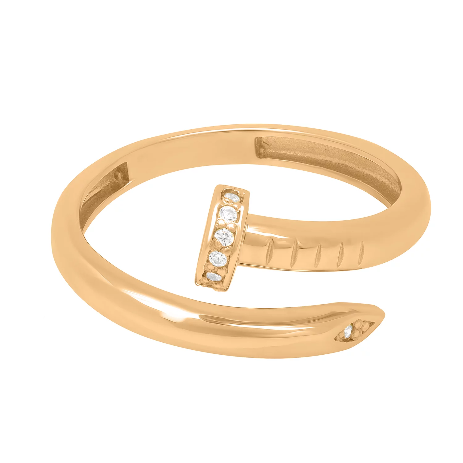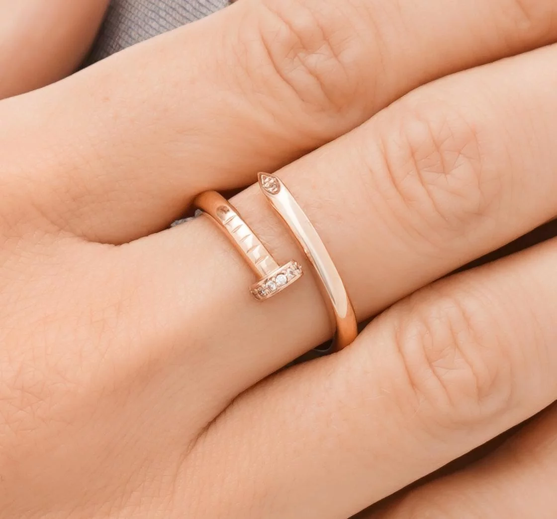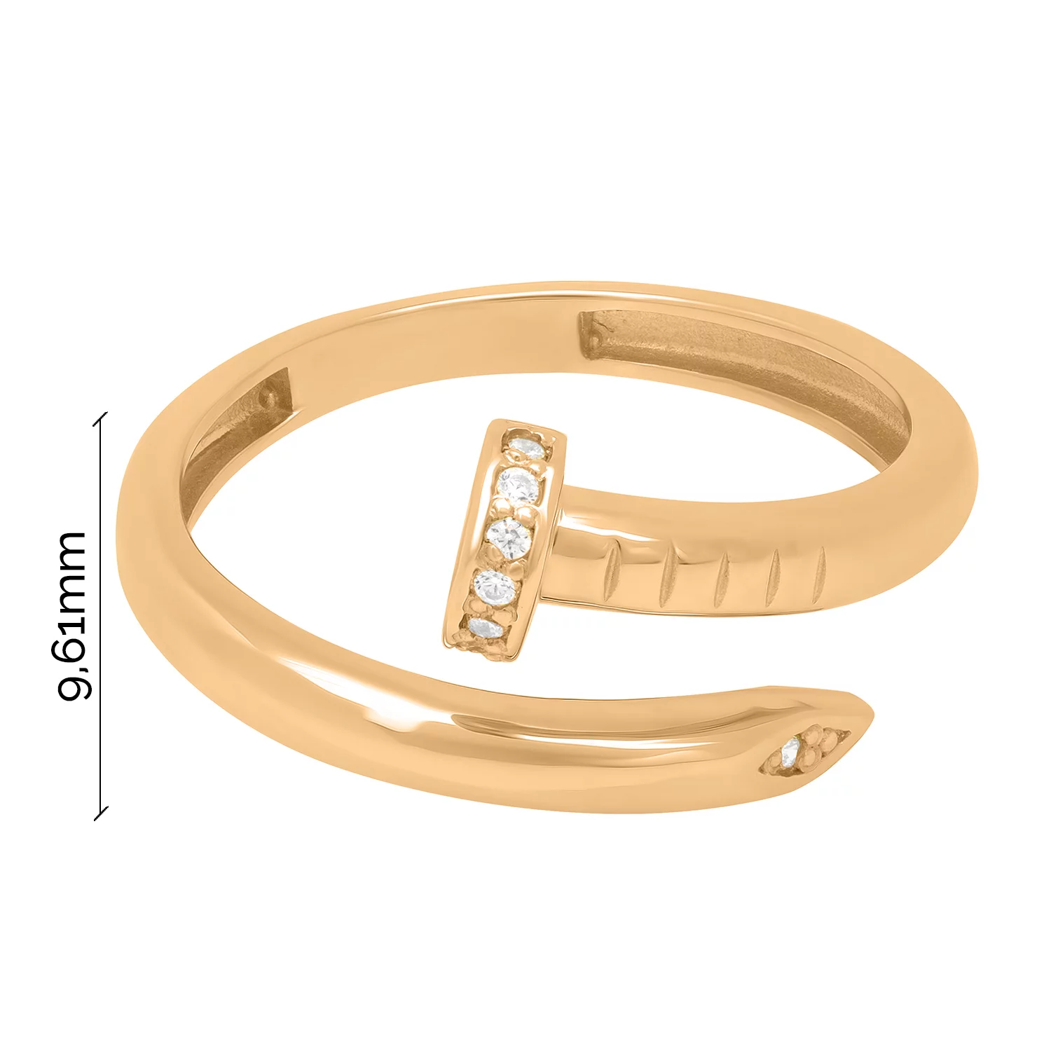 Каблучка у вигляді незамкненого цвяха – надзвичайно оригінальна і стильна прикраса. Вона вирізняється унікальністю і можливістю поєднуватися з будь-яким образом, у який привноситиме свіжість. Основний елемент дизайну – сяючі фіаніти круглого ограновування, розташовані на зовнішній поверхні виробу. Їхню витончену красу підкреслює благородний теплий відтінок червоного золота 585 проби. Каблучка в стилі Cartier ідеально підходить для повсякденного носіння і святкових випадків, а також як подарунок на дні народження, ювілеї.