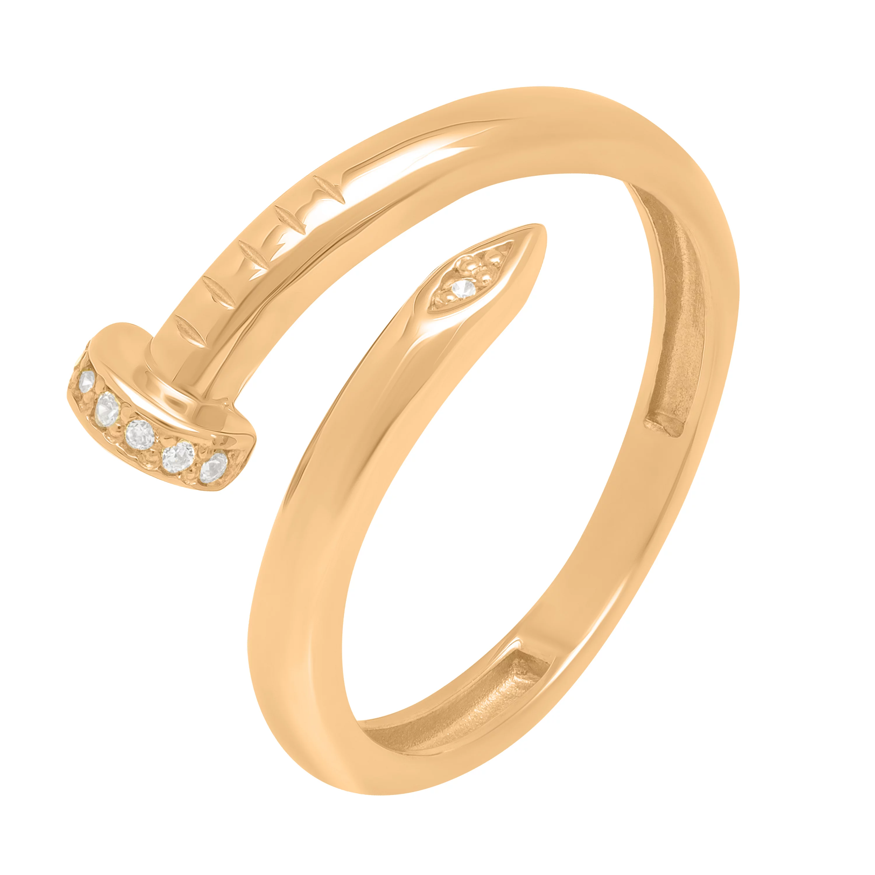 Каблучка незамкнена "Цвях" з фіанітами з червоного золота - 1614407