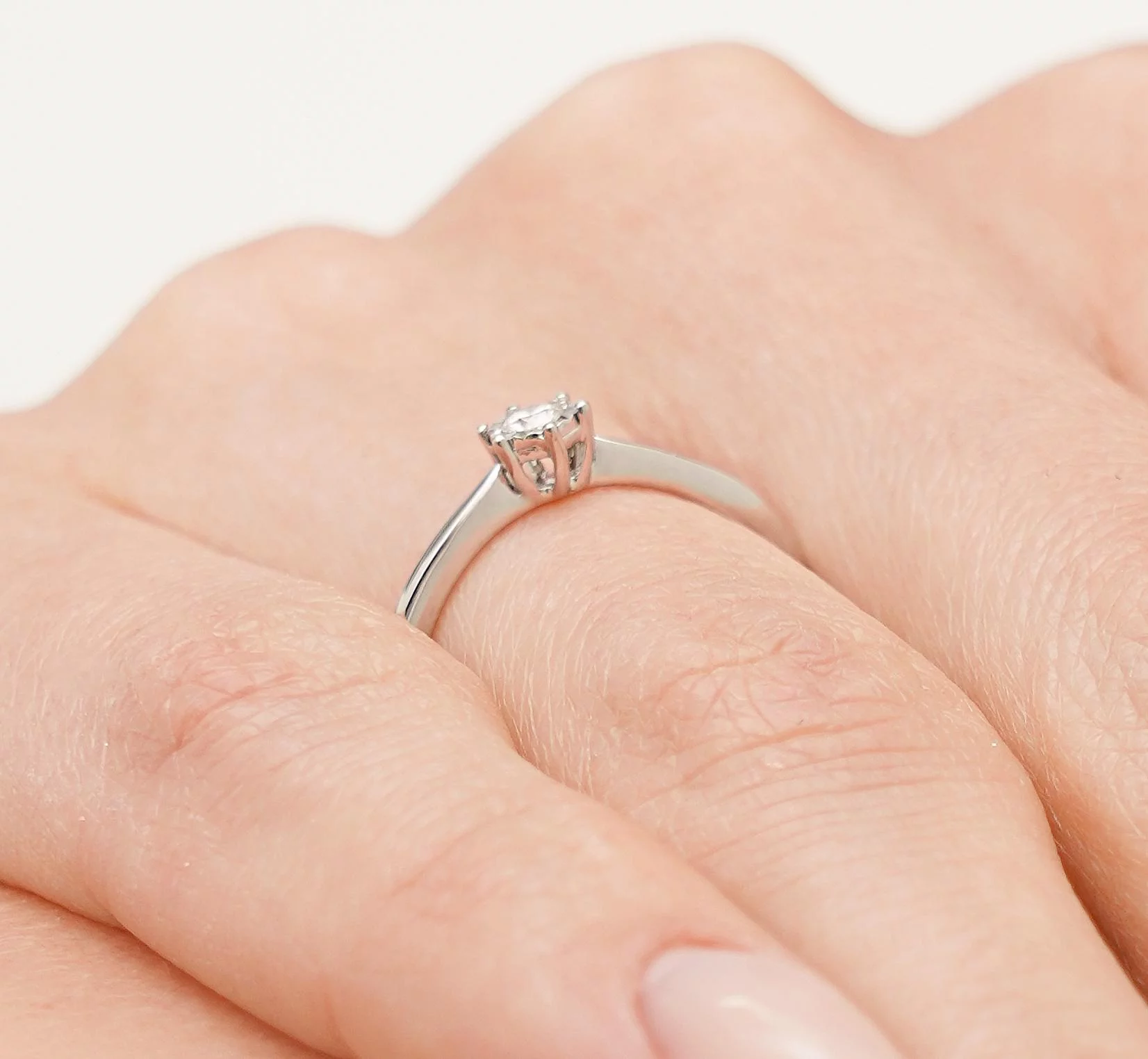 Лаконічна прикраса, створена з білого золота 585 проби. Для отримання холодного відтінку в сплав додають паладій. Весь акцент у виробі на камені — діаманті круглого огранювання. Воно якнайкраще підкреслює гру самоцвіту в променях світла. Закріплений кристал між шістьма гачками-крапанами. Вони надійно фіксують його та не дозволяють випасти. Шинка каблучки прямокутного перерізу, цільна, без виїмки із внутрішньої сторони. Поверхня гладка, дзеркальна, ідеально відполірована. Ювеліри зробили товщину обода мінімальною, щоб він зручніше сидів на пальці, не спричиняв дискомфорту.
