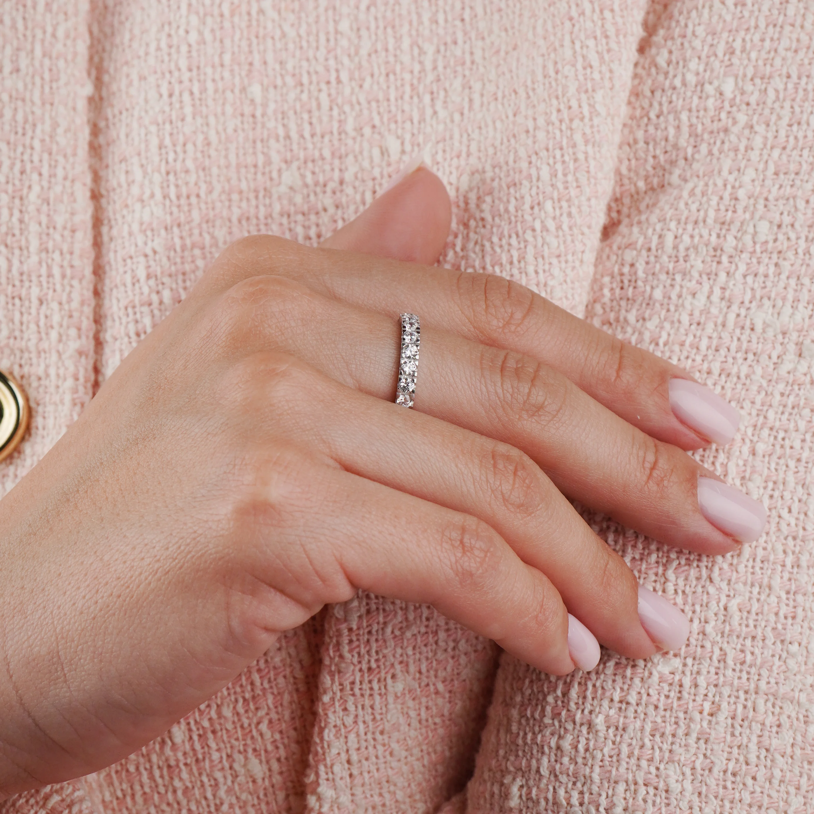 Каблучка з білого золота з фіанітною доріжкою — стильний виріб з елегантним дизайном, яскравим блиском каменів. Шляхетний метал 585 проби — це сучасна трендова основа для прикраси. Кругло ограновані фіаніти — вирощені камені, схоже на діаманти, — створюють ефект неймовірного сяйва, яке привертає увагу та підкреслює неповторність образу. Доріжка з них на всьому колі виробу додає вишуканості та розкоші. Каблучка ідеально підходить для особливих моментів — весіль, ювілеїв, її можна носити щодня. Це гарний подарунок дорогій людині.