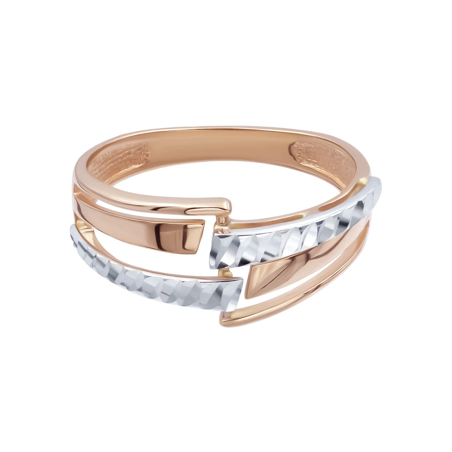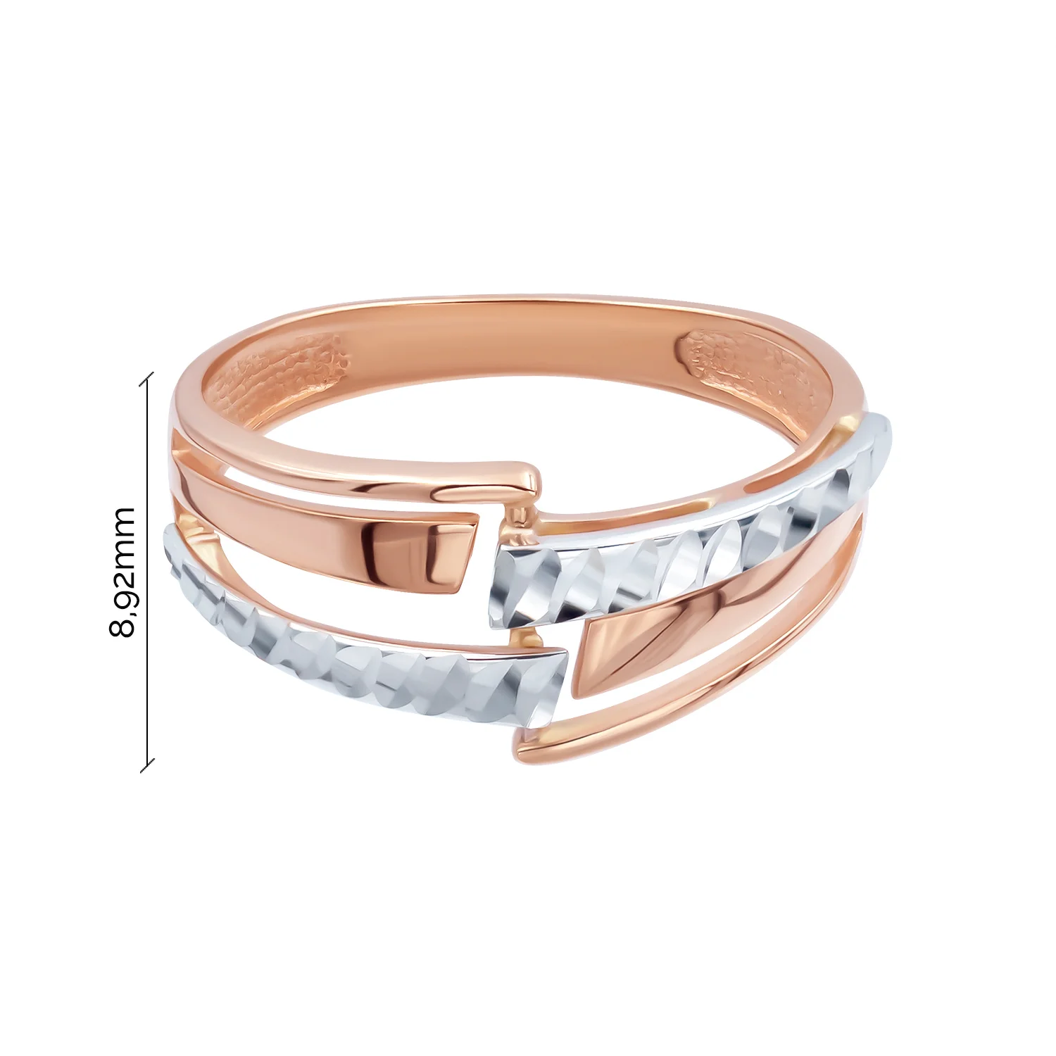 Класична каблучка з комбінованого золота — елегантна жіноча прикраса з ексклюзивним дизайном, яка стане чудовим подарунком. Ювелірний виріб виготовлений із поєднання білого та червоного дорогоцінних металів (сплав із додаванням міді) 585 проби. Красива гладка конструкція із золота приємного рожевого відтінку. А декорування у ній виконане за допомогою спеціальних рельєфних накладок з білого металу. Поєднання елементів прикраси, що знаходяться на різних рівнях та відрізняються формою, забезпечує цікавий візуальний ефект.