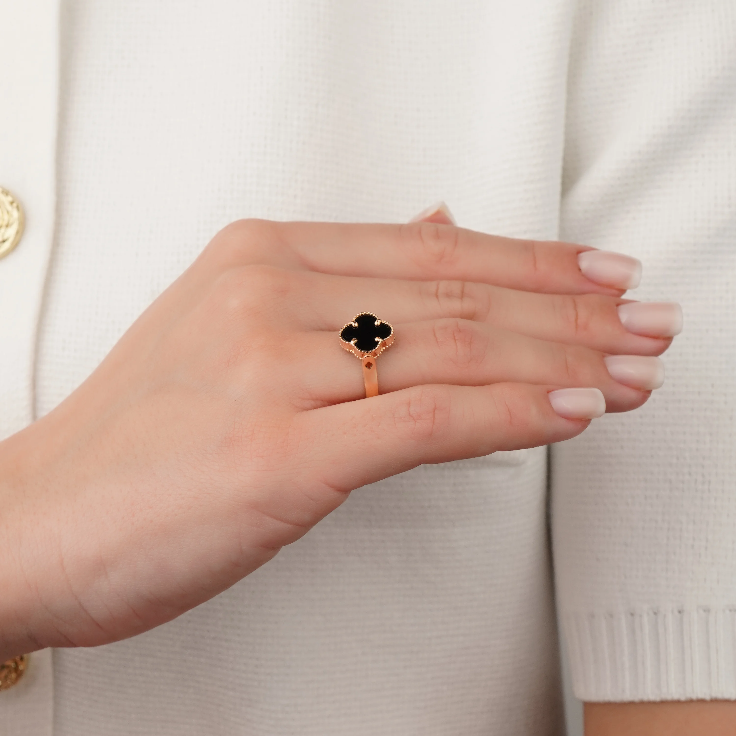 Двостороння каблучка з червоного золота "Конюшина" з оніксом і фіанітом - 1736306