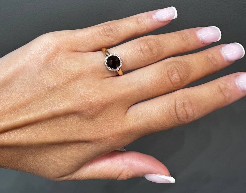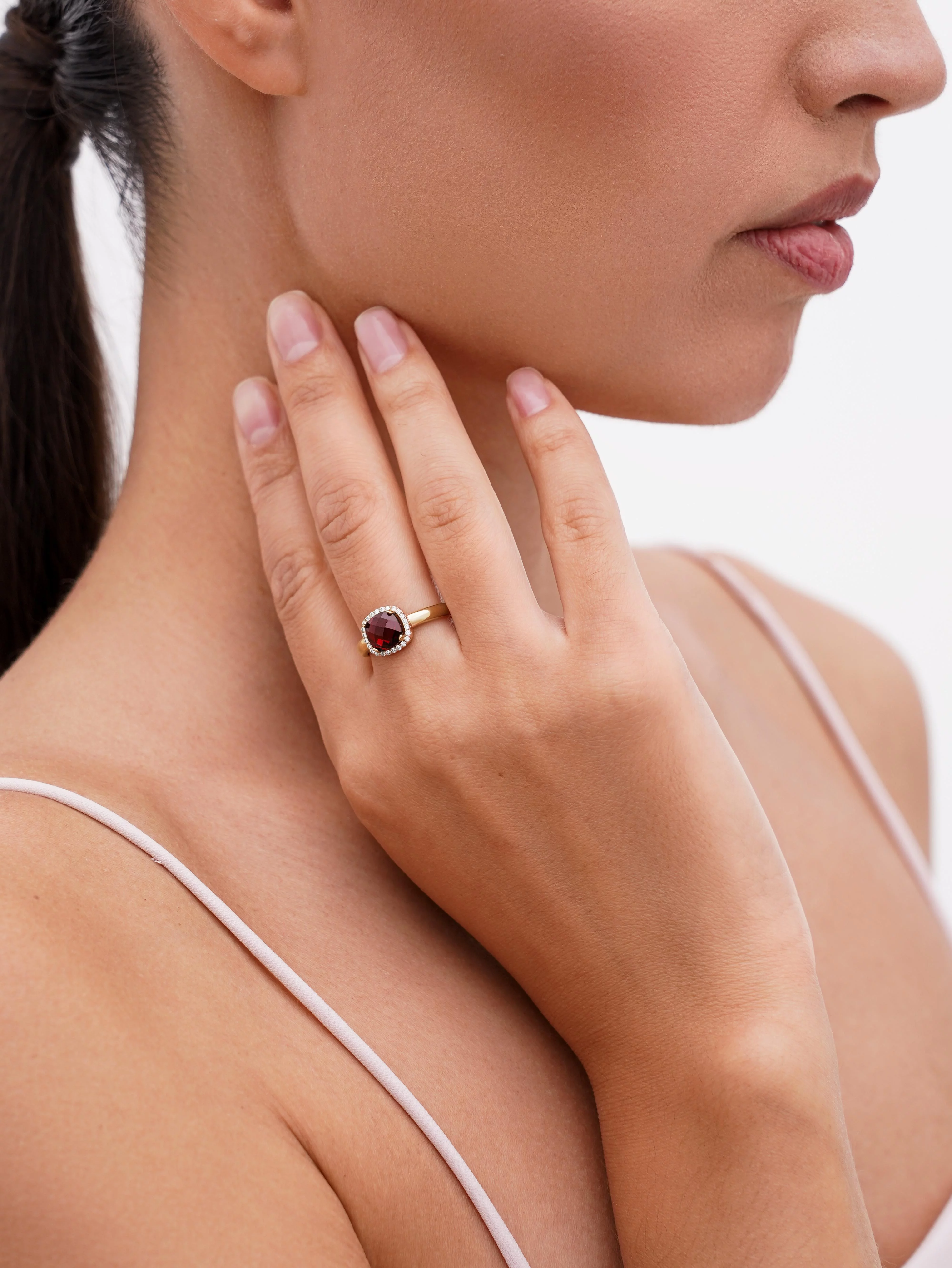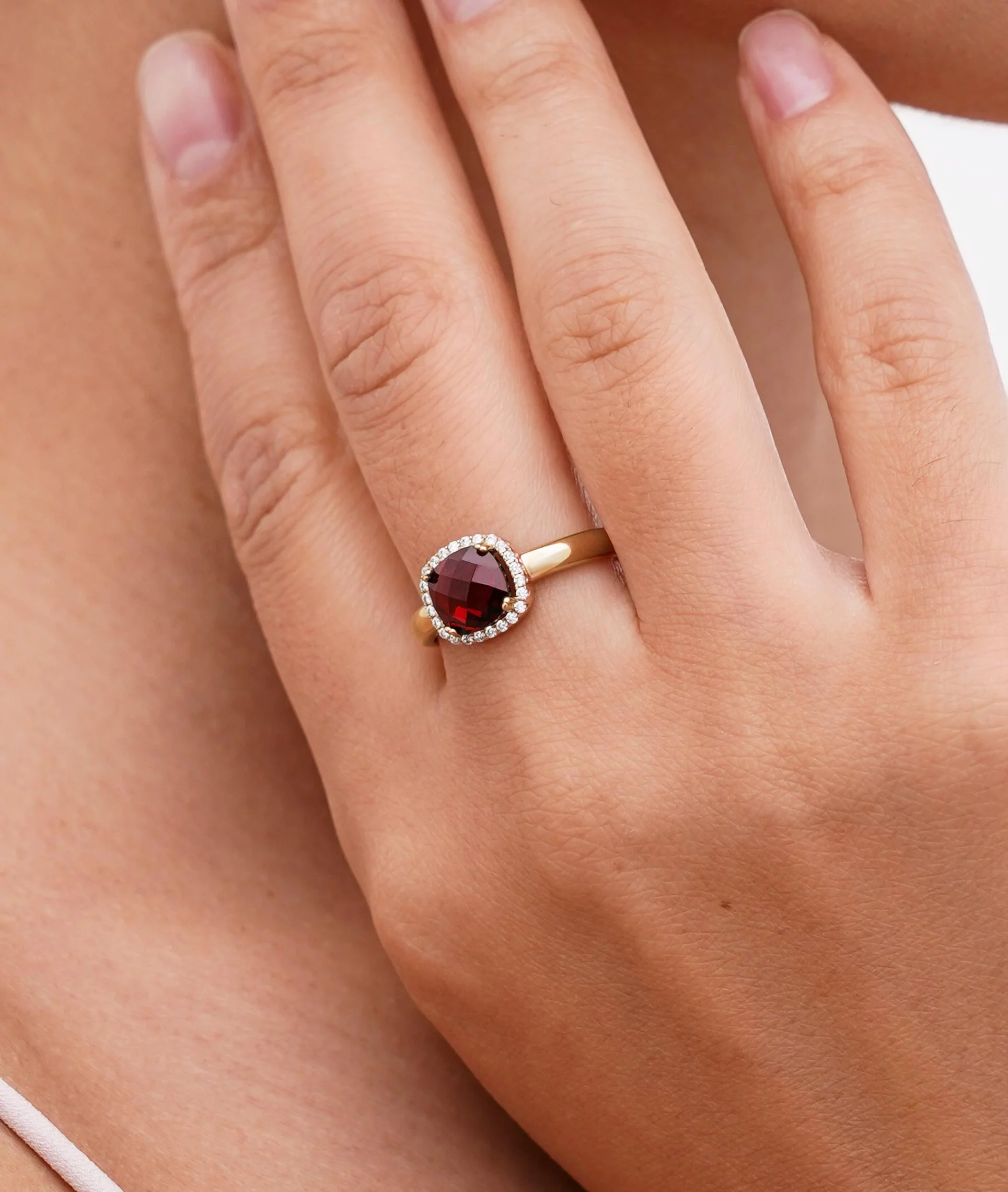Каблучка квадратної форми з гранатом і фіанітами з червоного золота - 1562253