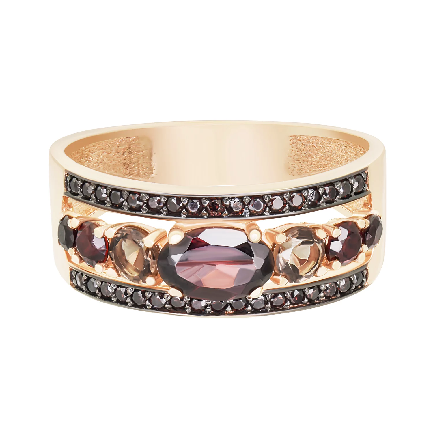 Каблучка з димчастим кварцем і фіанітами у комбінованому золоті - 538347