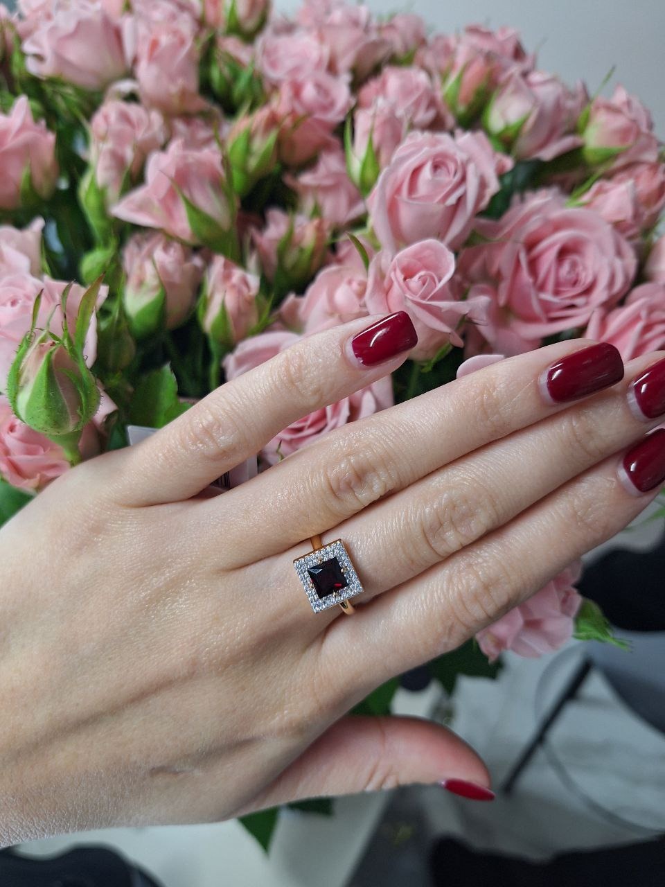 Каблучка квадратної форми з гранатом і фіанітами з червоного золота - 1562253