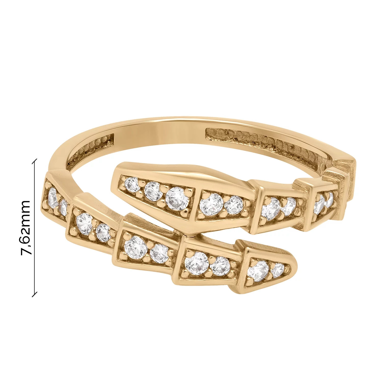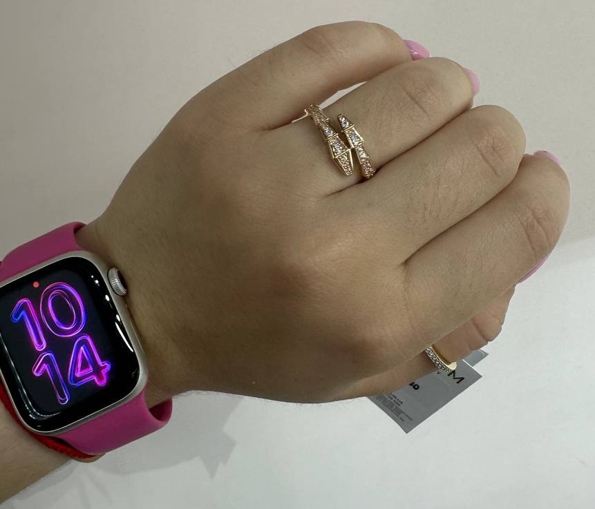 Каблучка «Змія» — оригінальне поєднання розсипу фіанітів, обрамлених у червоне золото. До основного складу благородного металу 585 проби додана мідь, що надає йому відтінку заходу сонця. Унікальний дизайн із контуром, що роздвоюється попереду, нагадує за формою змію. Така незвичайна каблучка асоціюється зі стилями булгарі, анімалістика, fashion. Форма обідка із чіткими гранями забезпечує надійне положення на пальці. Камені ювелірної прикраси закріплені всередині оправи — у повному візуальному доступі, але не випираючи на поверхні.