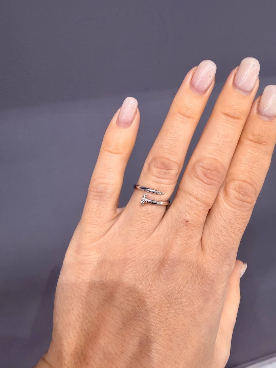 Каблучка для тих, хто розуміє та любить стиль Cartier. Прикраса незвичайного дизайну — цвях, обвитий навколо пальця. Урбаністичний стиль — у тренді, він допоможе виділитися з натовпу і підкреслити індивідуальність поглядів. Модель виготовлена зі стерлінгового срібла. У нього холодний світлий відтінок і гладка полірована поверхня. Капелюшок та кінчик цвяха декоровані фіанітами круглого огранювання. Камені, засаджені в гнізда основи, сяють на світлі, а срібло посилює їхній блиск. Каблучка вдало виглядатиме з джинсами та білою блузою, чорною сукнею, одягом у стилі гранж.