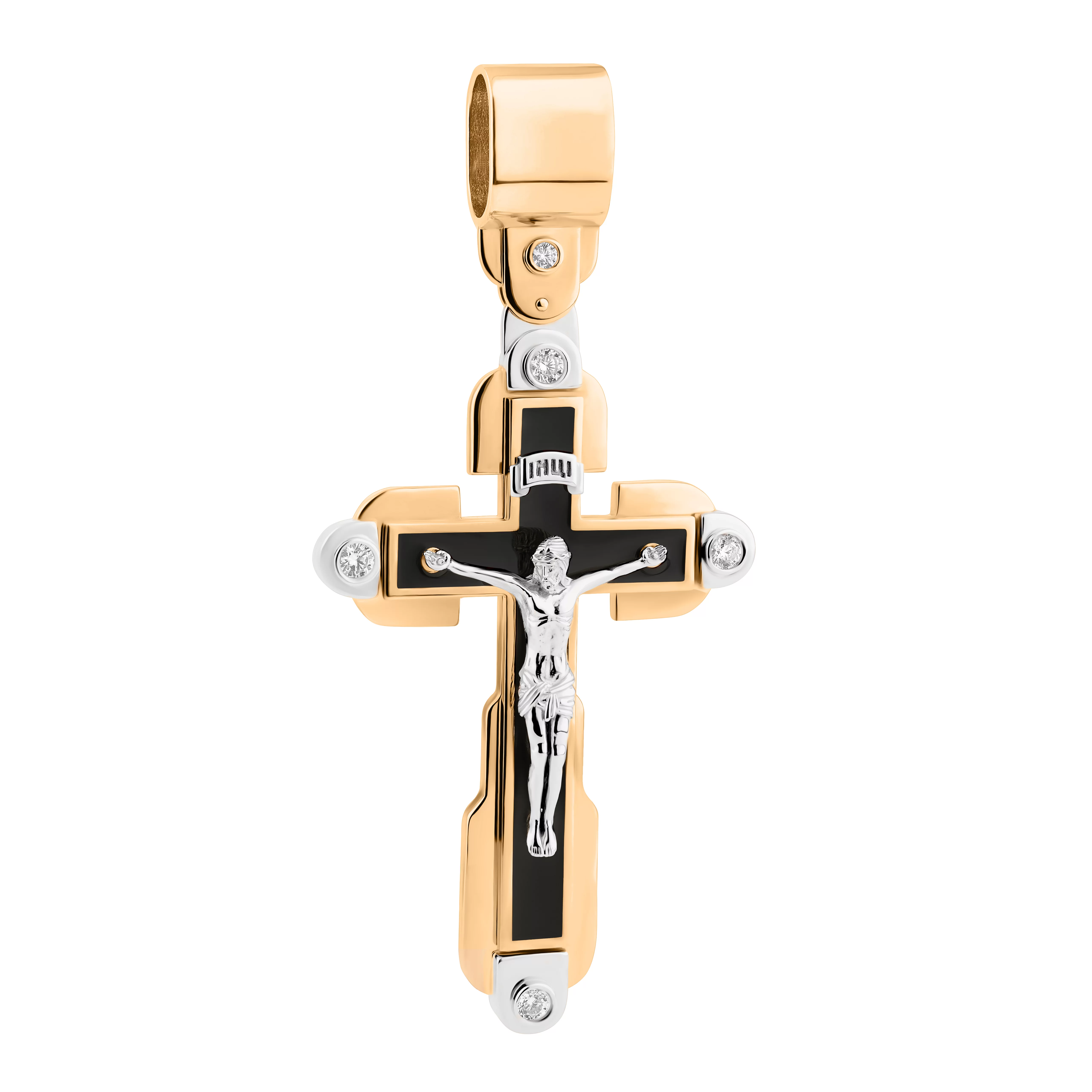 Хрестик "Ісус Христос" з комбінованого золота з емаллю та фіанітами - 1922329