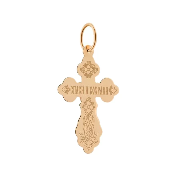 Хрестик виконано з комбінованого золота 585 проби. Дизайн вирізняється глибокою ідеєю об’єднати аскетичність буття Ісуса Христа та духовне піднесення після Воскресіння. Реалізовано це у вигляді подвійного хреста, виконаного в двох різних декоративних напрямках. Для оформлення застосовані елементи гофрування. Це додає прикрасі фактурності, а об’ємні грані при сонячних променях створюють ефект сяяння. Зворот хрестика містить гравіювання із церковним написом та візерунки. Прикраса виконана у класичному стилі. Однаково підійде чоловікам, жінкам та дітям.