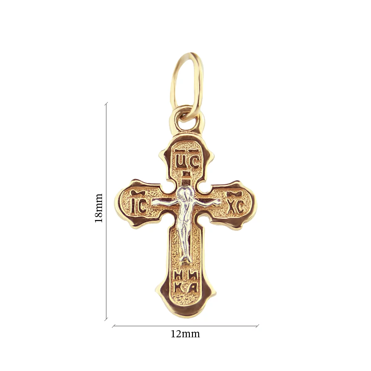 Хрестик із комбінованого золота привабить особистостей, які звикли обирати для себе щось особливе. Виріб ефектно вирізняється з-поміж інших завдяки цікавим формам, лініям і поєднанню кількох відтінків золота. Головний елемент прикраси розп'яття виконаний із благородного білого золота. Неоднорідна червона фактура додає виробу оригінальності, а обрамлення більш насиченого відтінку стає завершальним штрихом у цілісній картині. Текстові вставки також грають на користь дизайнерського задуму і прекрасно гармонують з облямівкою такого ж відтінку.