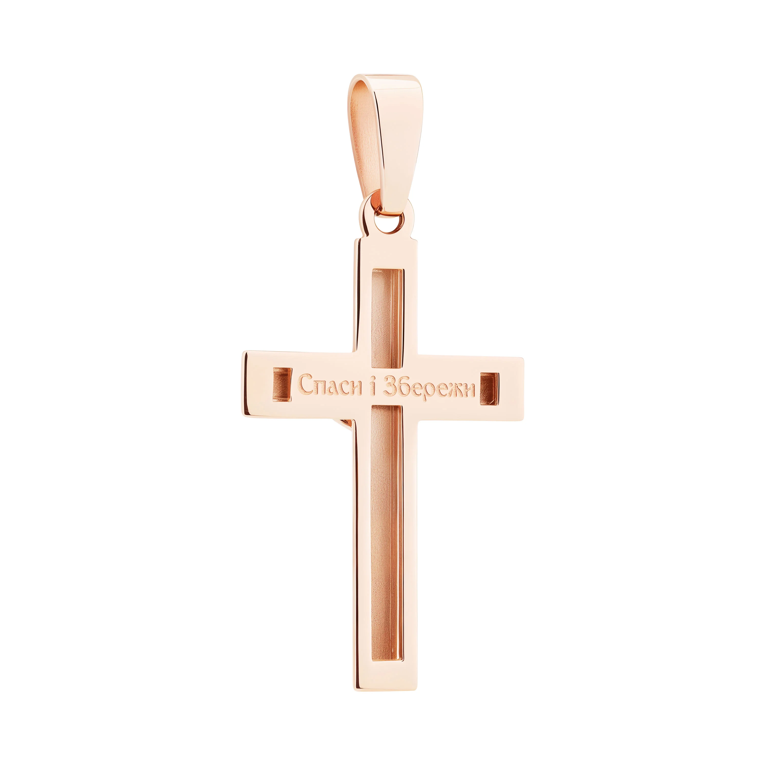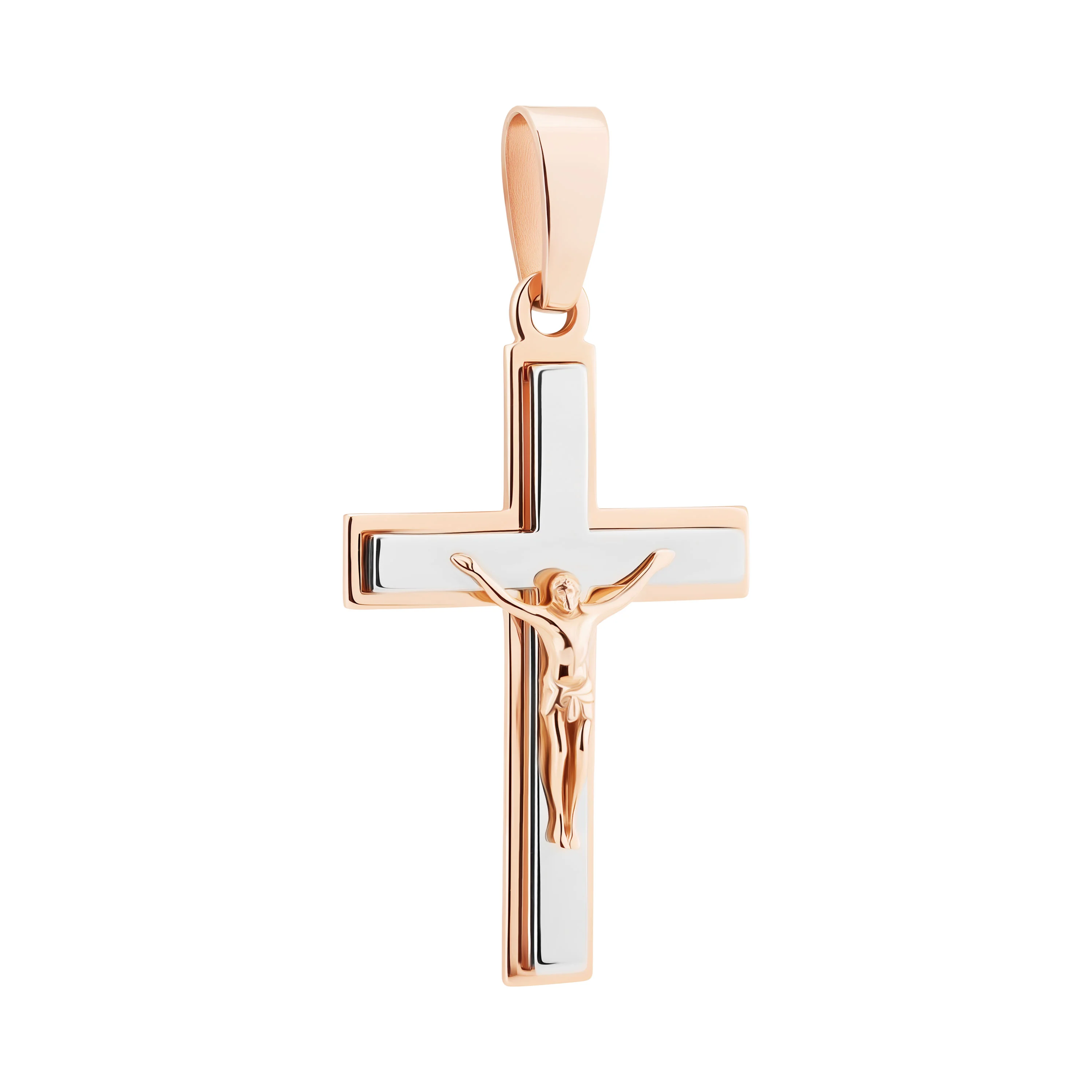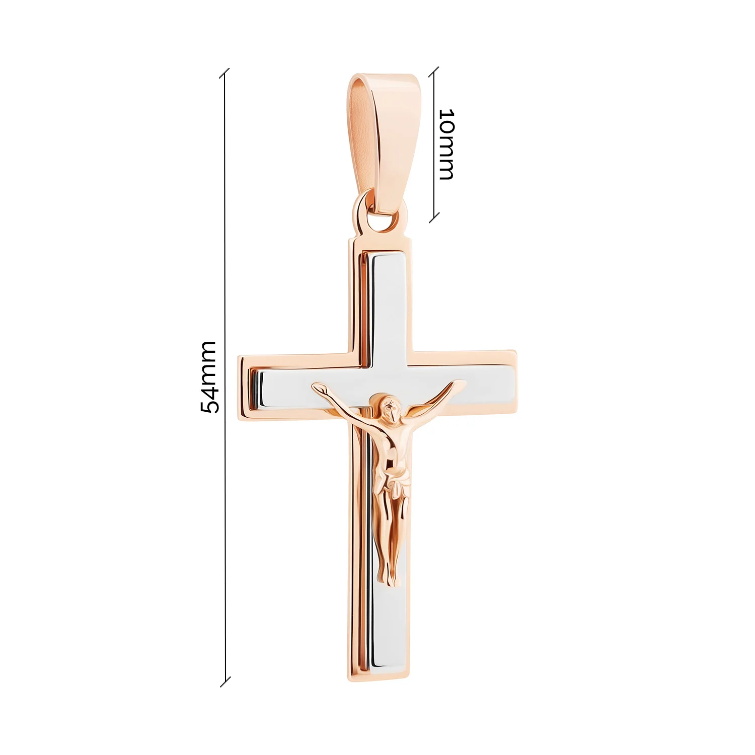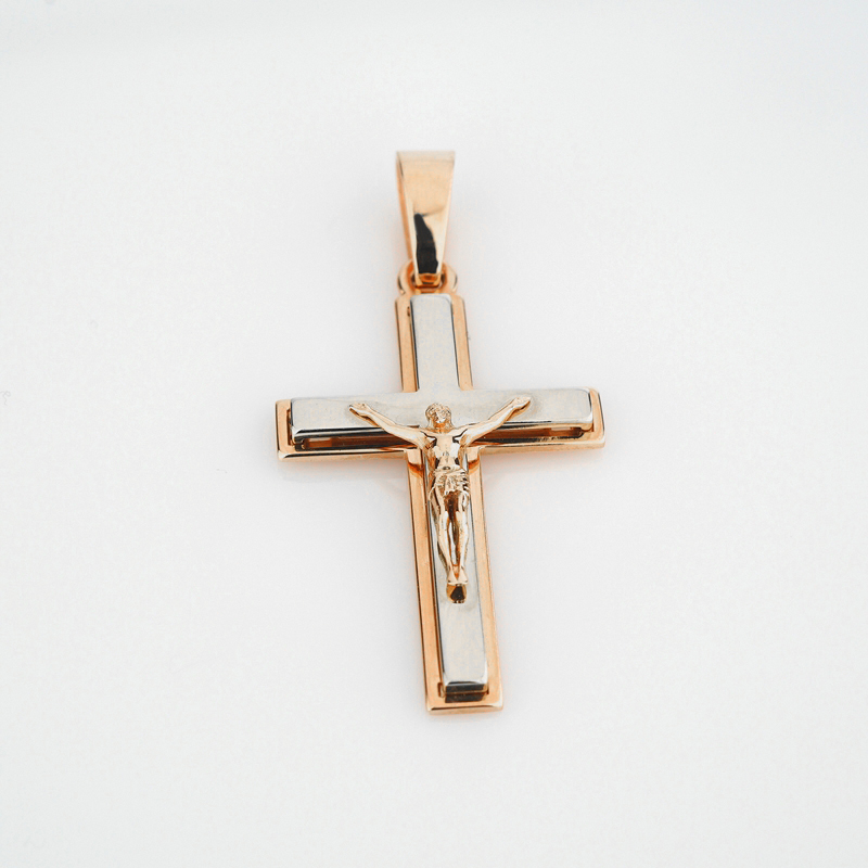 Хрестик із комбінованого золота — втілення завжди актуальної класики, а поєднання білого та червоного блиску металу додає родзинки. Чітка геометрія форм поєднується з доречною масивністю виробу, а об'ємне розп'яття стає композиційним центром. Біле тло для зображення Христа та червона рамка гармонійно балансують, а на тильному боці розташований напис-оберіг. Прикраса стане стильним доповненням образу та матиме особливий сакральний зміст для власника. Біле та червоне золото 585 проби — міцне, стійке до різних впливів та появи подряпин.