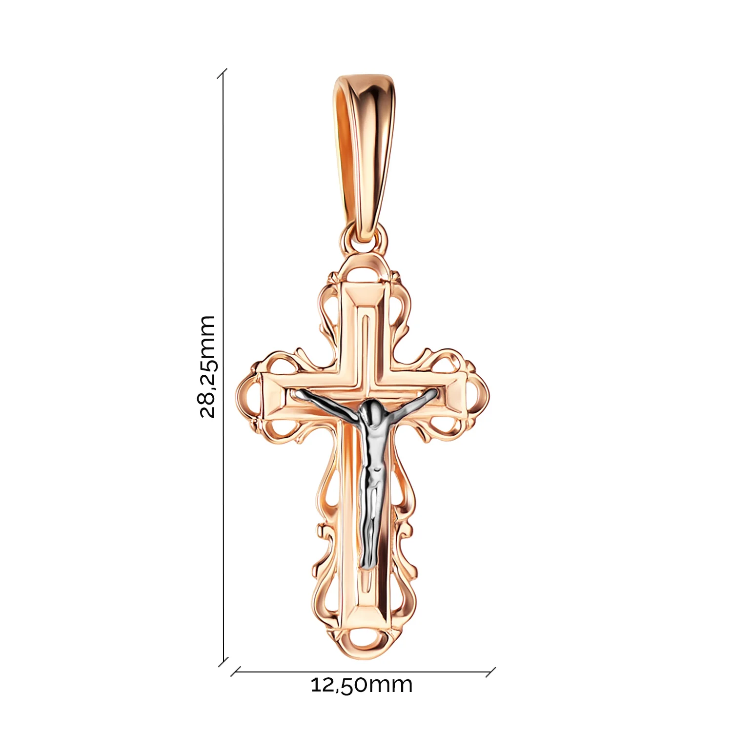 Хрестик із розп'яттям символізує порятунок людства Ісусом Христом. Прикраса створена з комбінації білого та червоного золота 585 проби. Дизайн кулона привертає увагу вишуканістю та витонченістю. Хрест має форму трилисника, символізуючи єдність Бога, Сина і Святого Духа. Щоб виділити розп'яття на тлі золота, використовується чорніння. Ювелірний виріб підійде як подарунок жінці, чоловікові та дитині. Порадувати близьку людину гарним презентом можна на день ангела, хрестини, Різдво. Він чудово доповнить повсякденне та вечірнє вбрання.