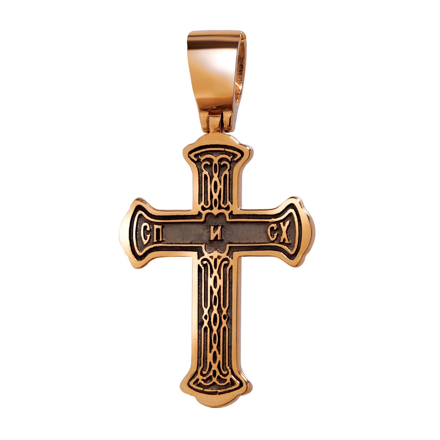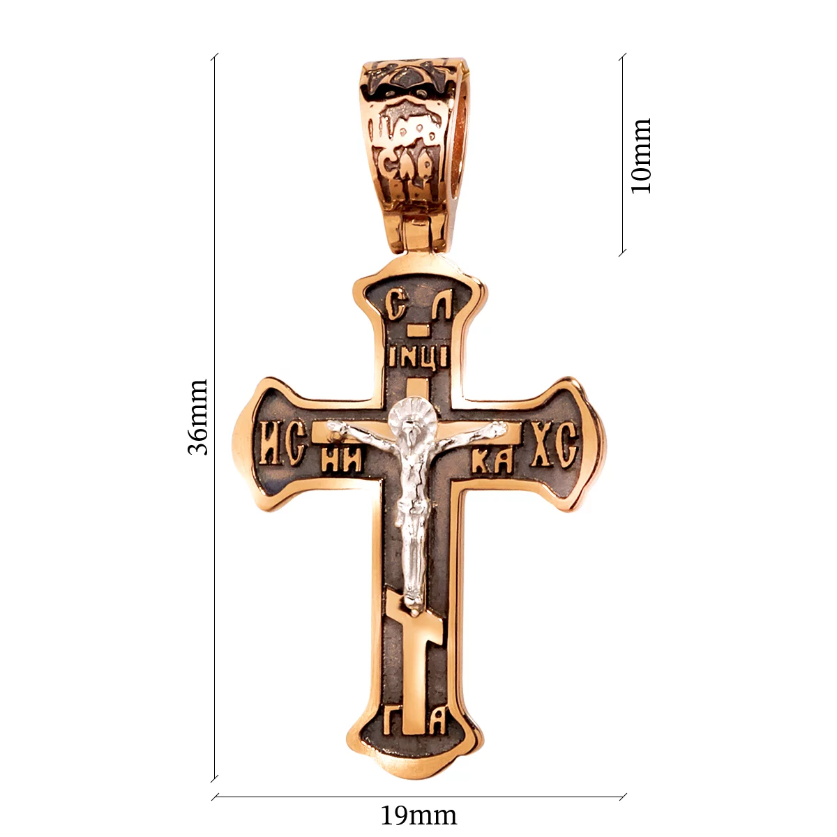 Хрестик із комбінованого золота з чорнінням вирізняється глибоким символізмом і наявністю оригінального орнаментального гравіювання. Натільний хрестик виготовлено з дорогоцінного металу 585 проби. Основа хреста, виконана з червоного золота, має фігурну форму. У центрі виробу – вигравіруване розп'яття на восьмикутному хресті, який по-особливому виділено на зачорненому тлі. На окрему увагу заслуговує різьблення на виробі: на хрестику вигравірувані стародавні православні символи, що оберігають власника від злих сил.