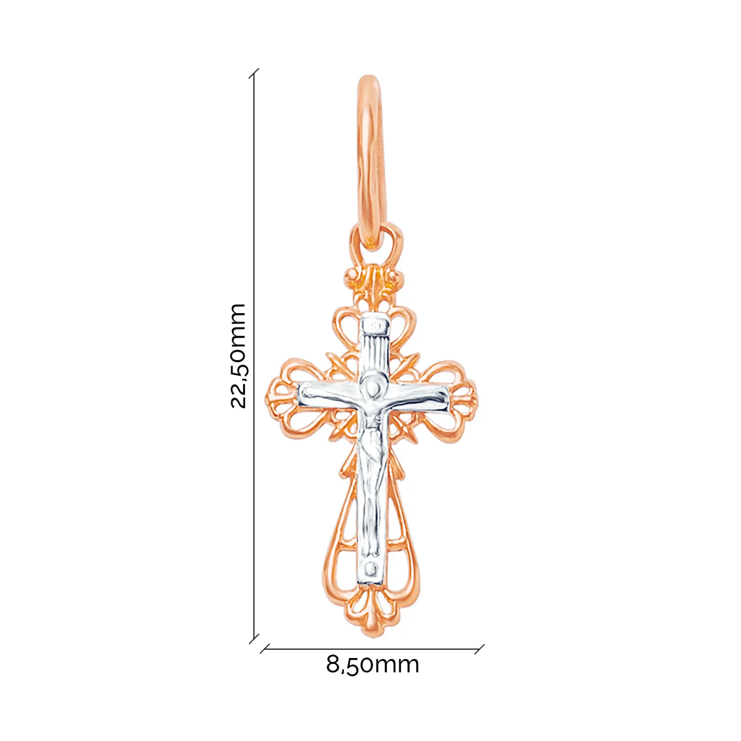 Хрестик виконаний із комбінації червоного та білого золота 585 проби. Прикраса, декорована розп'яттям, символізує жертву, яку Ісус Христос приніс заради порятунку людства. Голова його увінчана німбом, що наголошує на Божественній причетності. Форма хреста — трилисник — означає єдність Бога, Сина і Святого Духа. Коштовність універсального дизайну, тому підходить і під вбрання щодня, і під вечірній образ. Прикраса стане чудовим подарунком для близької людини на іменини, хрестини, Різдво або в іншому випадку.