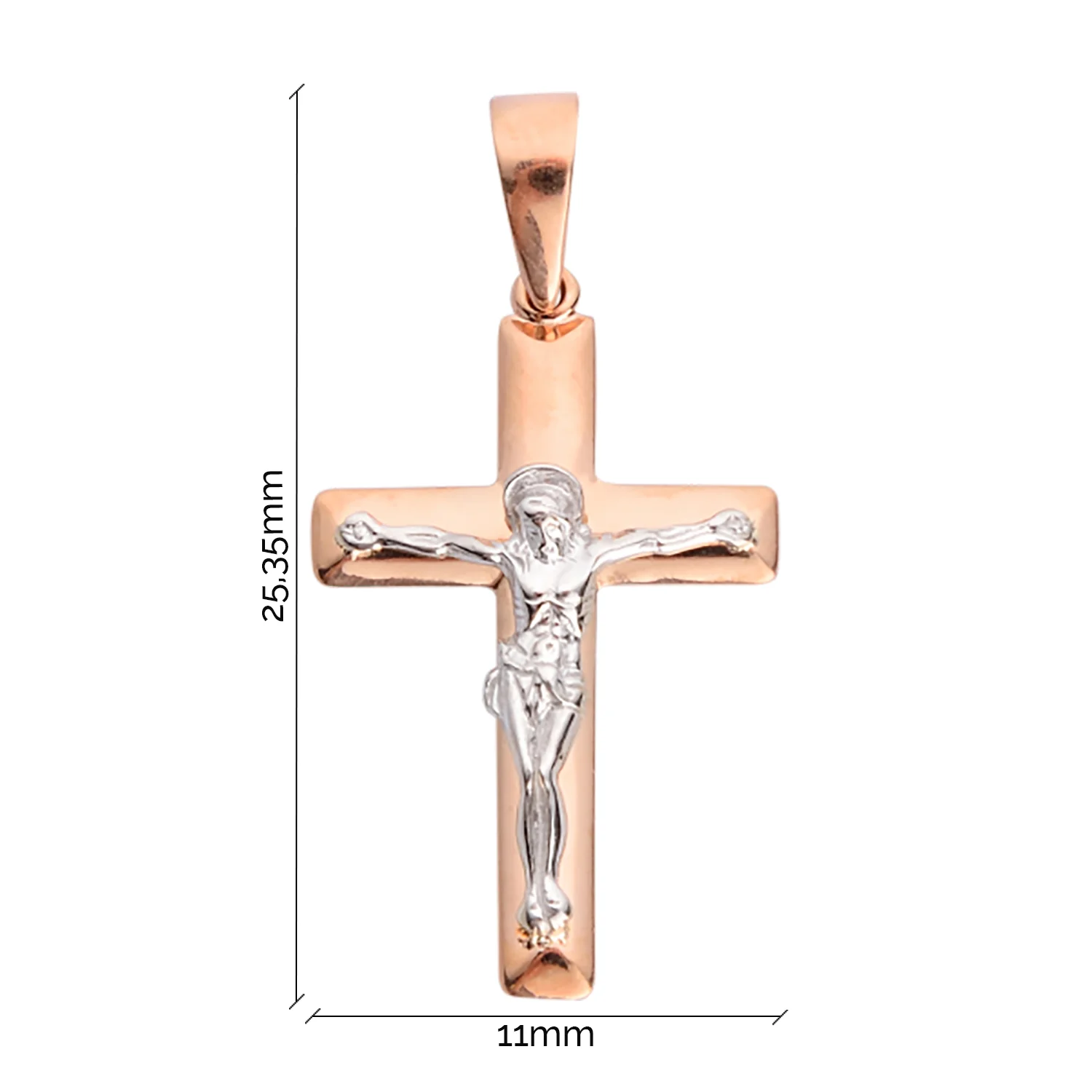 Контрастне поєднання білого і червоного золота — тандем, якого не бояться яскраві особистості. Хрестик із червоного та білого золота має два основні елементи — масивне тіло з чіткою геометрією та об'ємне розп'яття. На перший погляд, вони кардинально різні, але насправді ефектно доповнюють один одного. Ідеально гладка поверхня фону балансує з невеликою фактурністю розп'яття, а передача кольору створює оригінальний естетичний ефект. Якісний сплав дорогоцінних металів із додаванням компонентів для збільшення міцності чудово проявляється в службі та зберігає свій вигляд роками.
