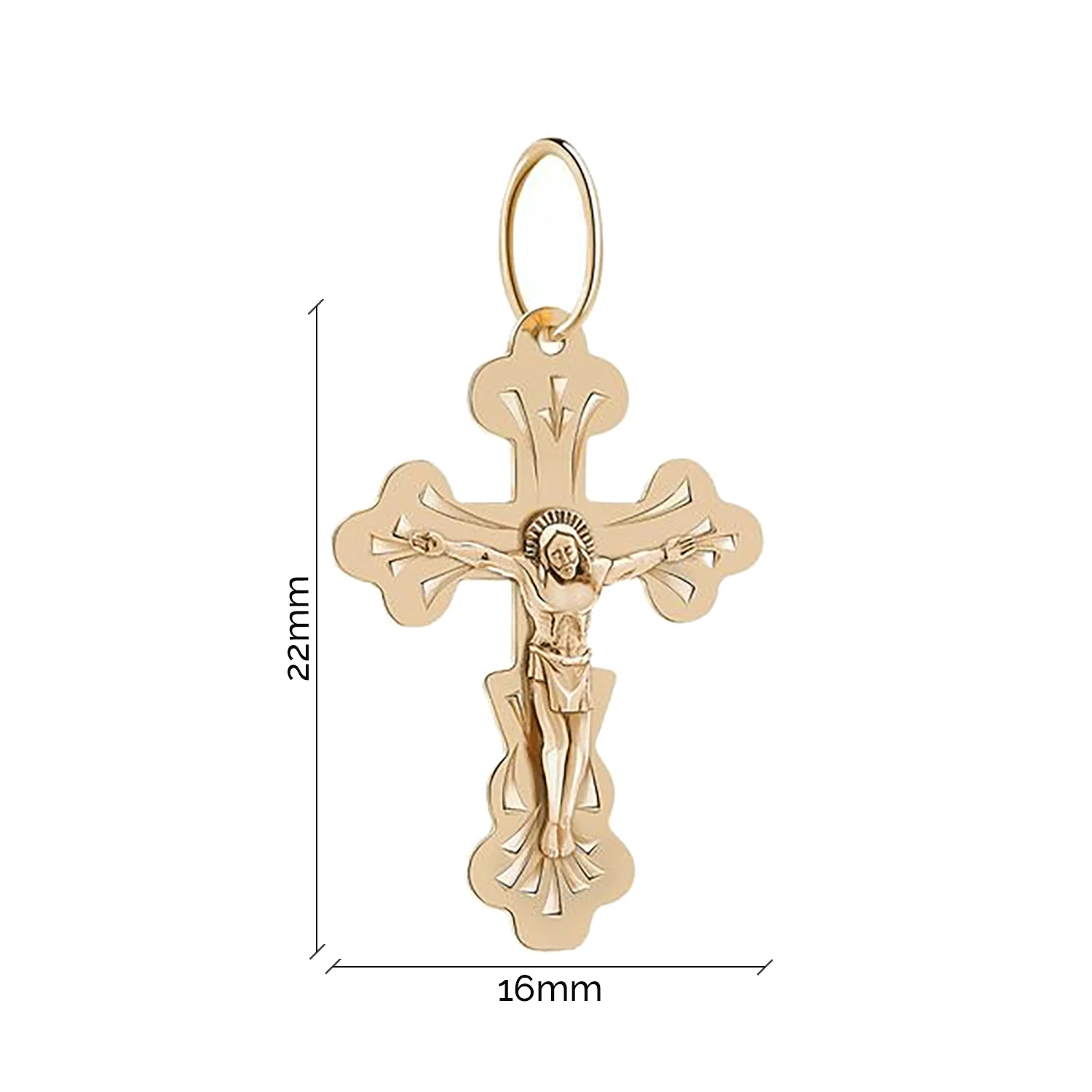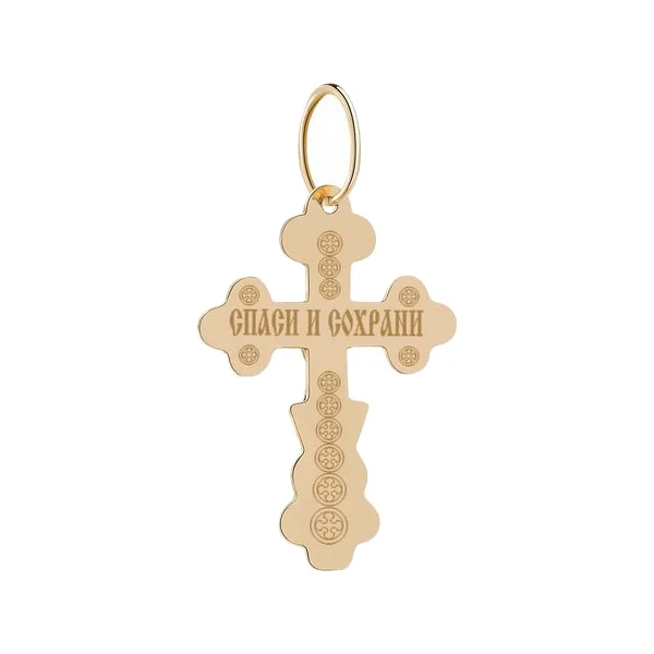 Класичний натільний православний хрестик у формі трилисника. Символізує Святу Трійцю. Виготовлений з червоного золота 585 проби. Красивого відтінку виробу надає мідь, якою легують сонячний метал і роблять його довговічним. Тендітні різьблення на кінцях роблять прикрасу витонченою, легкою. На зворотному боці штампований напис «Спаси і збережи» та символічне зображення хреста. Модель унісекс, а завдяки невеликим розмірам пасуватиме дітям. Хрестик підійде у якості подарунка не тільки на хрестини, а й на інші знакові дати.