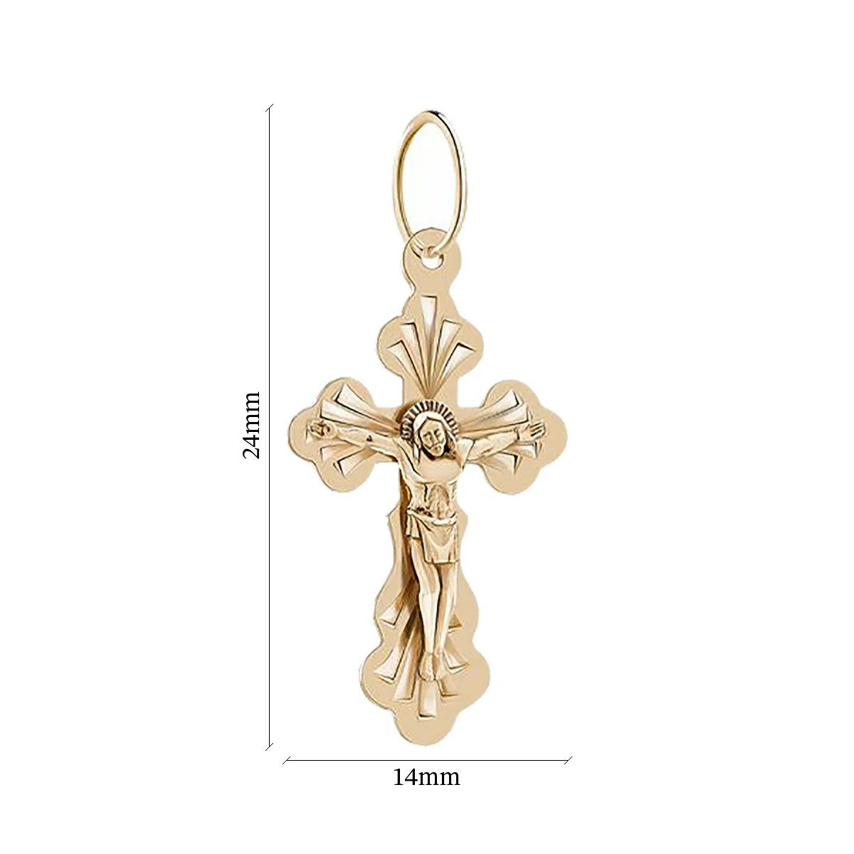 Охайна, майже невагома прикраса. Виготовлена з червоного золота 585 проби. Рудим відтінком наділяють її домішки міді. Цей матеріал забезпечує міцність ювелірного витвору. Виконаний у класичному стилі. По всій поверхні глибоке різьблення. На кожному кінці хреста по три невеликих півкола, що символізують листя трилисника. Натільна сторона виробу має традиційне гравіювання «Спаси і Збережи» та християнський орнамент. Розп’яття виразне, відображає напругу тіла Ісуса. Такий хрестик буде гарним подарунком на визначну дату.