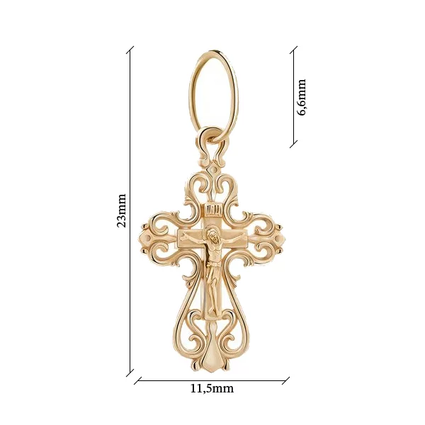 Композиція з релігійним символом може бути витонченою та лаконічною. Натільна прикраса виконана у вигляді візерунків у формі хреста. У центрі виробу релігійний символ розп'яття Ісуса Христа. На зворотному боці хреста ювеліри додали фразу "Спаси і збережи". Об'ємні букви доповнюють загальну концепцію натільного хрестика. Візерунки відмінно поєднуються з теплим кольором червоного золота, який виходить завдяки наявності міді в сплаві. Хрестик невеликого розміру не заважатиме під час щоденного використання. Метал міцний і стійкий до пошкоджень, не боїться підвищеної вологи.