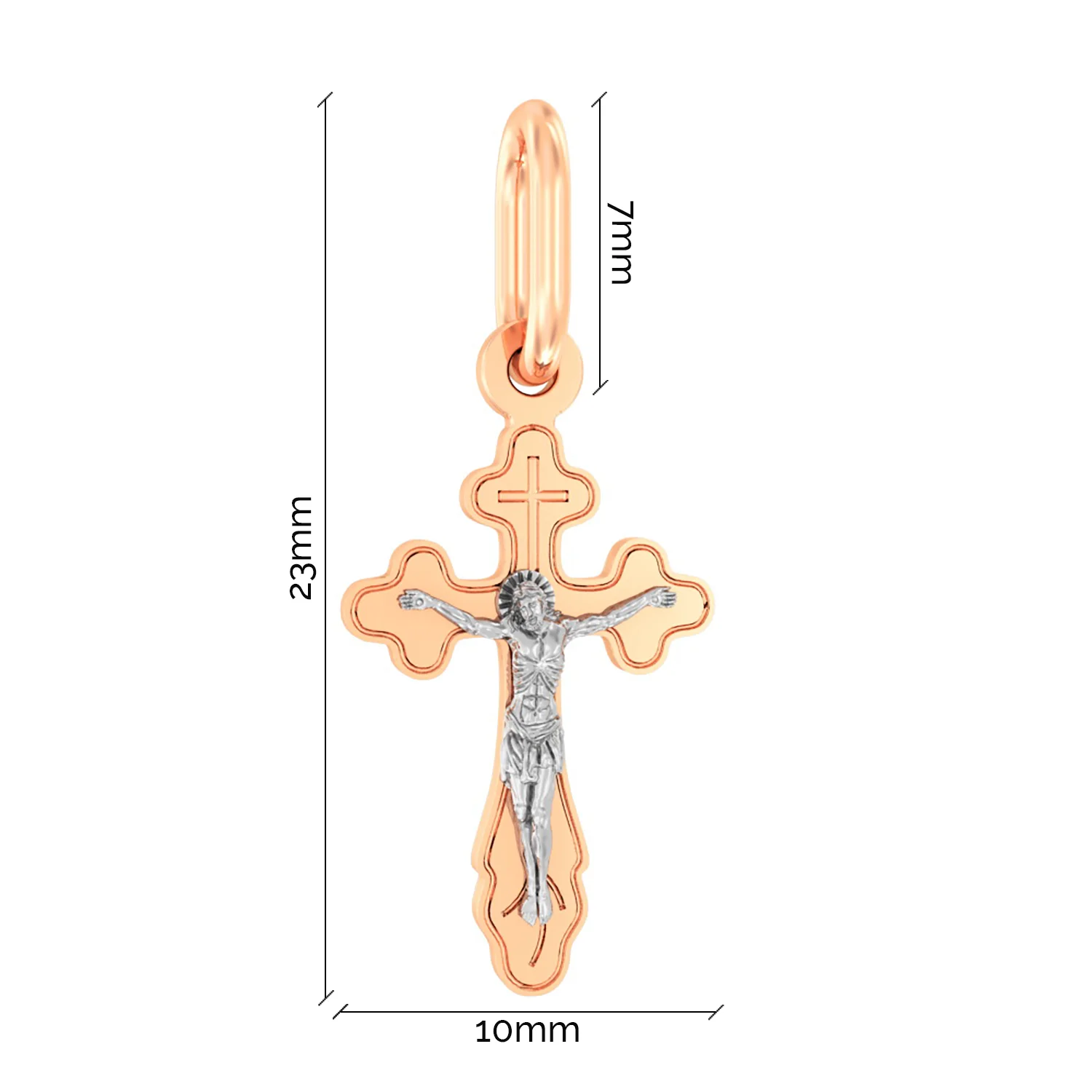 Хрестик із червоного золота 585 проби прикрашений розп'яттям, що символізує страждання Ісуса Христа заради порятунку людства. Вираз його обличчя демонструє умиротворення та торжество добра над злом. Голову Спасителя увінчано німбом, символізуючи святість. Ювелірна прикраса характеризується класичним дизайном, тому чудово підійде дітям, жінкам та чоловікам. Доповніть повсякденне або вечірнє вбрання хрестиком, щоб підкреслити його витонченість та елегантність. Виріб стане чудовим подарунком на честь іменин, хрещення чи Різдва.