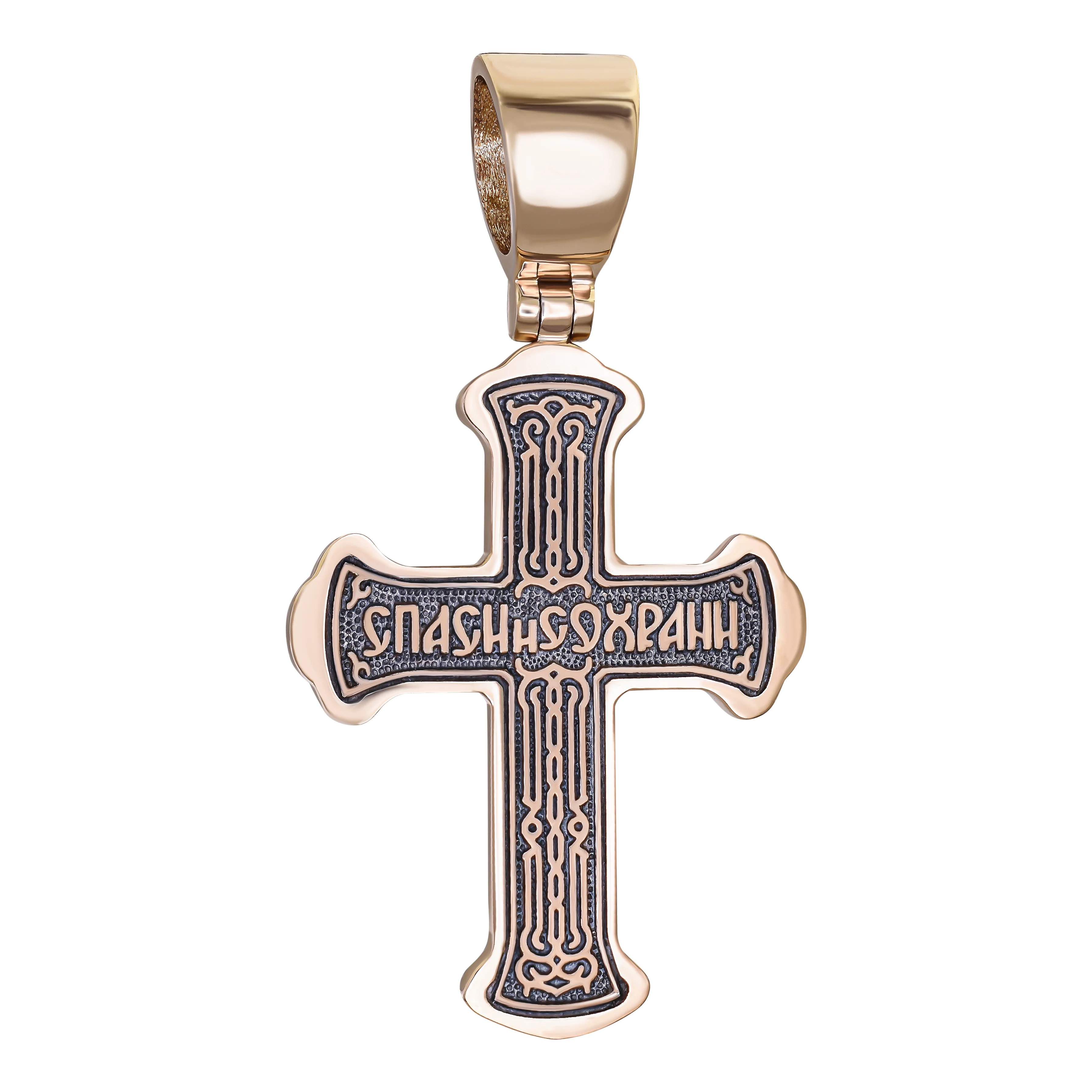 Хрестик із червоного золота з чорнінням – традиційний натільний хрестик, виконаний у класичному стилі. Золота хрестоподібна оправа, виконана у формі трилисника, стильно об'єднана з восьмигранним хрестом з розп'яттям, розташованим на темному тлі. Це тло є головним колірним акцентом виробу. Досягнуто такого ефекту завдяки стародавній ювелірній техніці чорніння дорогоцінного металу, що робить образ натільного хрестика більш глибоким. Зроблено хрестик із золота 585 проби. На виробі вигравірувані християнські фрази і стародавні орнаменти.