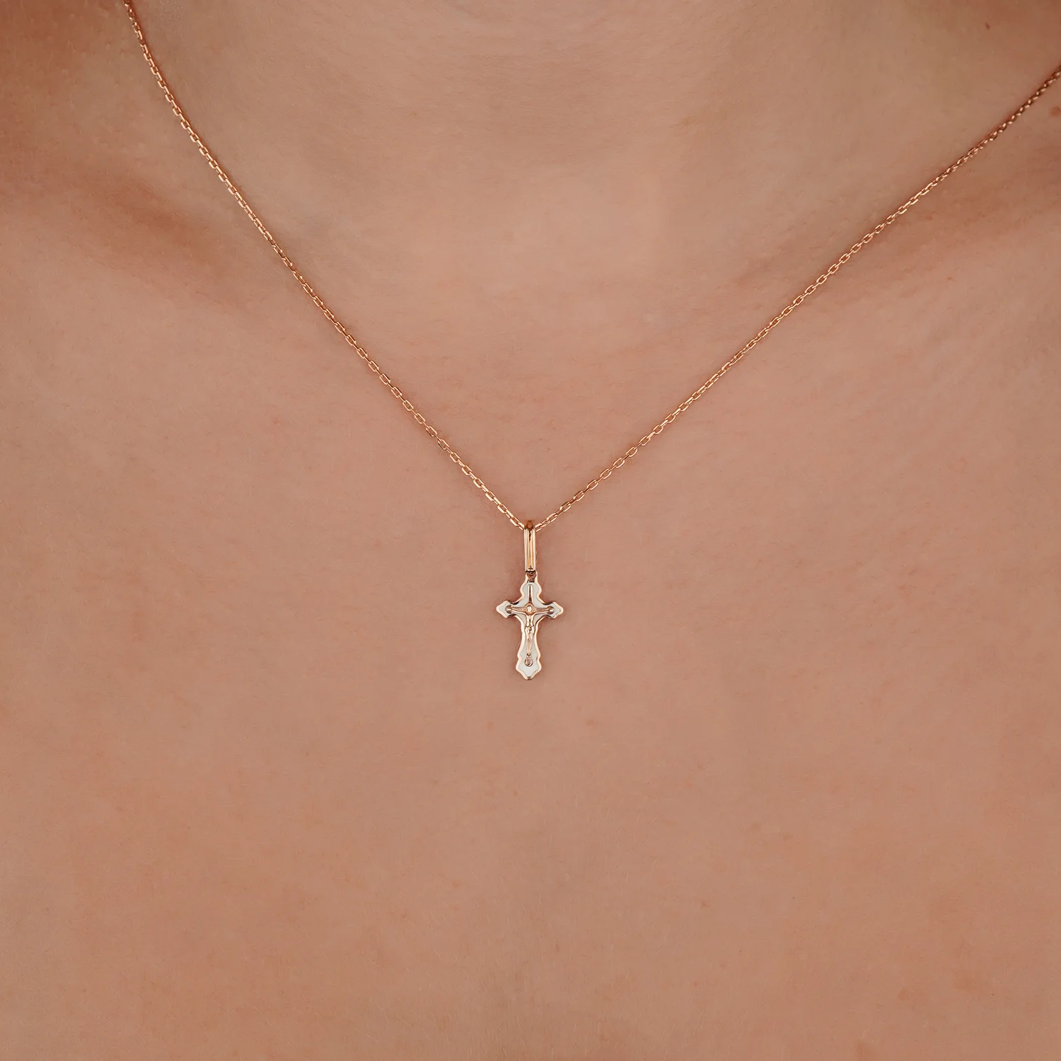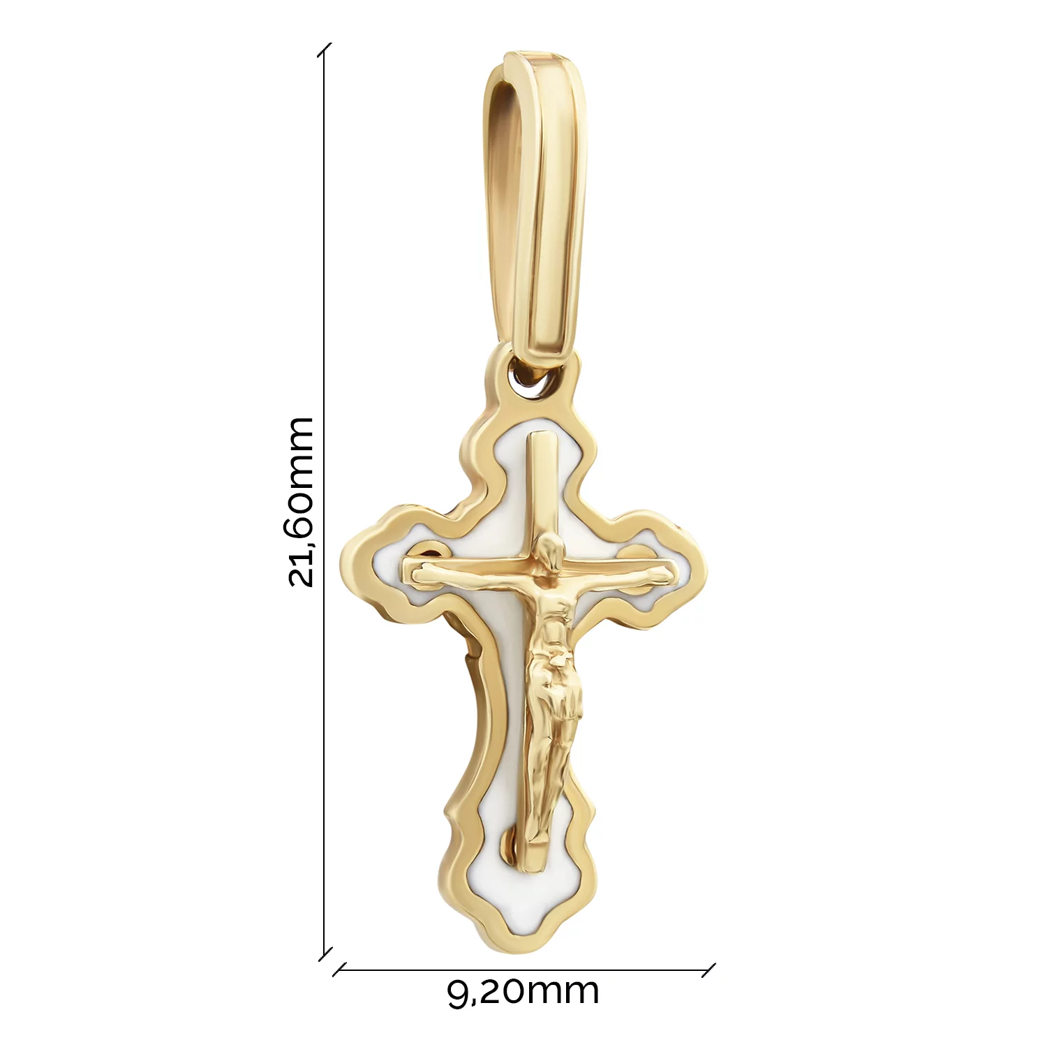 Хрестик створений із червоного золота 585 проби. Ювелірний виріб доповнений вставкою з емалі білого кольору. Прикраса декорована розп'яттям, яке символізує приношення Ісусом Христом себе в жертву заради порятунку всього людства. Руки Сина Божого спочивають на верхній поперечині, ніби він готовий обійняти весь світ. Класичний дизайн ювелірного виробу відмінно доповнить звичайне вбрання або додасть витонченості та елегантності вечірньому аутфіту. Піднести хрестик можна у вигляді подарунка близькій людині на день народження, Різдво або з іншого приводу.