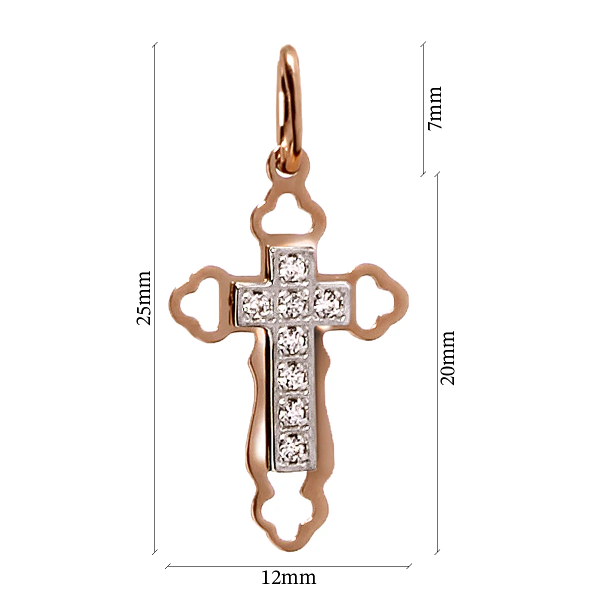 Жіночий хрестик із червоного золота зі вставками цирконію. Прикраса візуально розділена на дві частини. Внутрішня - з дорогоцінним камінням, а зовнішня - з геометричними мотивами. Виріб виготовлено з металу 585 проби. Сплав складається на 58,5% із золота, а решта 41,5% - лігатурні елементи. Добавки надають м'якому золоту міцності та міцності. Хрестик добре поєднується з ланцюжками різних відтінків і плетінь. Його легко комбінувати з іншими прикрасами. Ювелірний виріб підійде для повсякденного носіння, завершення ділових та урочистих образів.