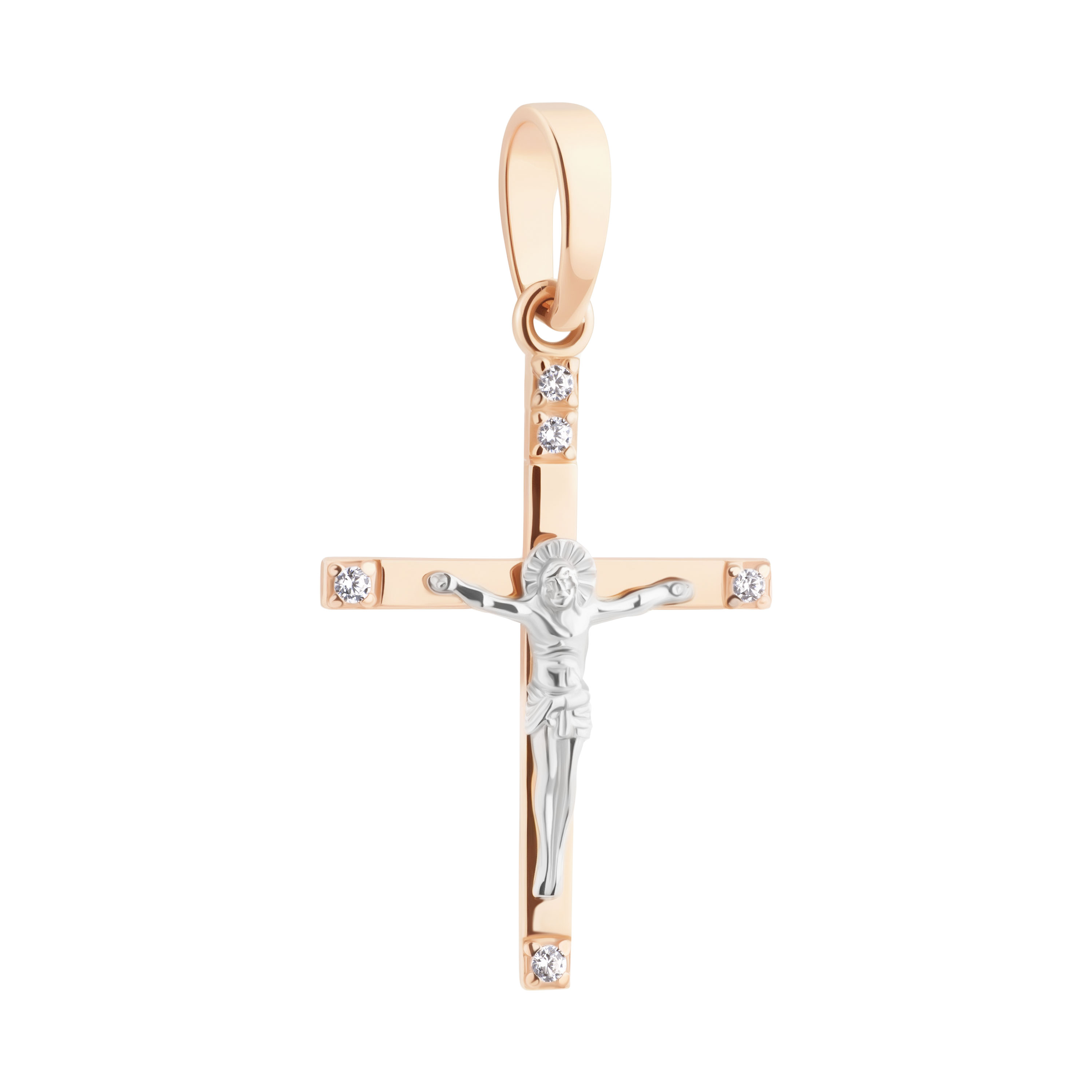 Хрестик з розп'яттям з комбінованого золота з фіанітами - 2147344