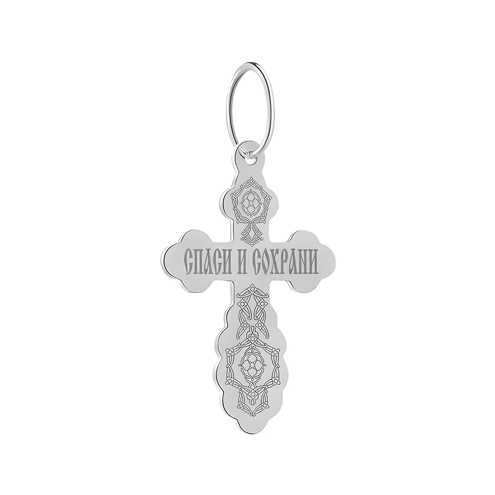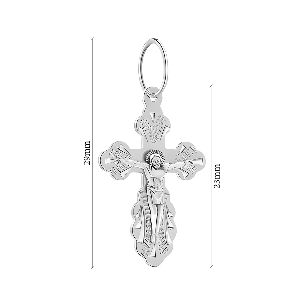 Хрестик унісекс із білого стерлінгового срібла. Метал 925 проби практично позбавлений домішок, відсоток аргентуму в складі – 92,5. Сплав гіпоалергенний, стійкий до деформацій, відрізняється зносостійкістю. Хрестик прикрашений тематичними фігурами і насічками. Ювелірний виріб із фігурними гранями. Коштовність підійде як подарунок до народження дитини, хрестин, ювілею та інших свят. Срібну прикрасу легко поєднувати з різними стилями, наприклад, повсякденним, casual і діловим, ланцюжками з білого золота і срібла.