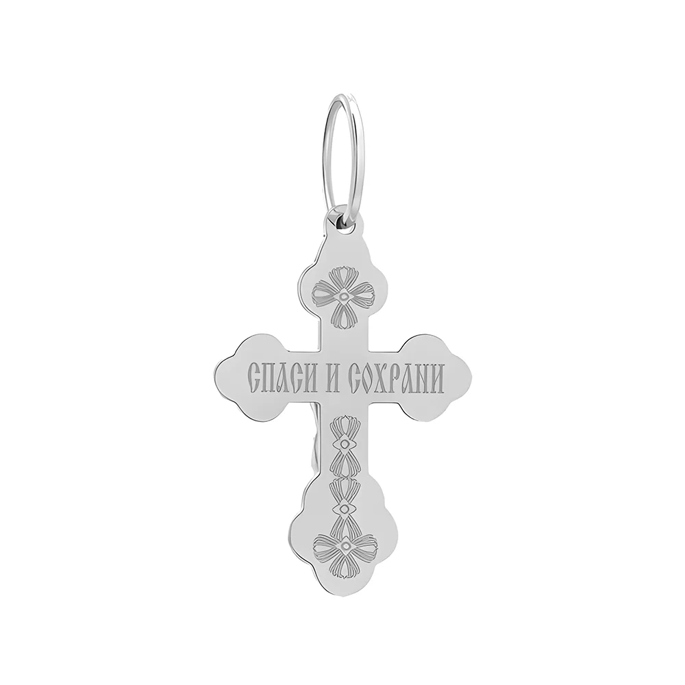 Витончений фігурний хрестик зі срібла 925 проби, виготовлений з бездоганним виконанням найдрібніших деталей. На лицьовій стороні — тривимірне зображення розп'яття, на зворотному — вигравіруваний напис «Врятуй і збережи». Завдяки стриманому дизайну виріб стане елегантним повсякденним аксесуаром, його можна придбати як подарунок рідній людині, другові чи колезі, чудово підійде як перший хрестик для дитини. При належному догляді метал збереже свої блиск та яскравість, поєднуватиметься з іншими срібними прикрасами.